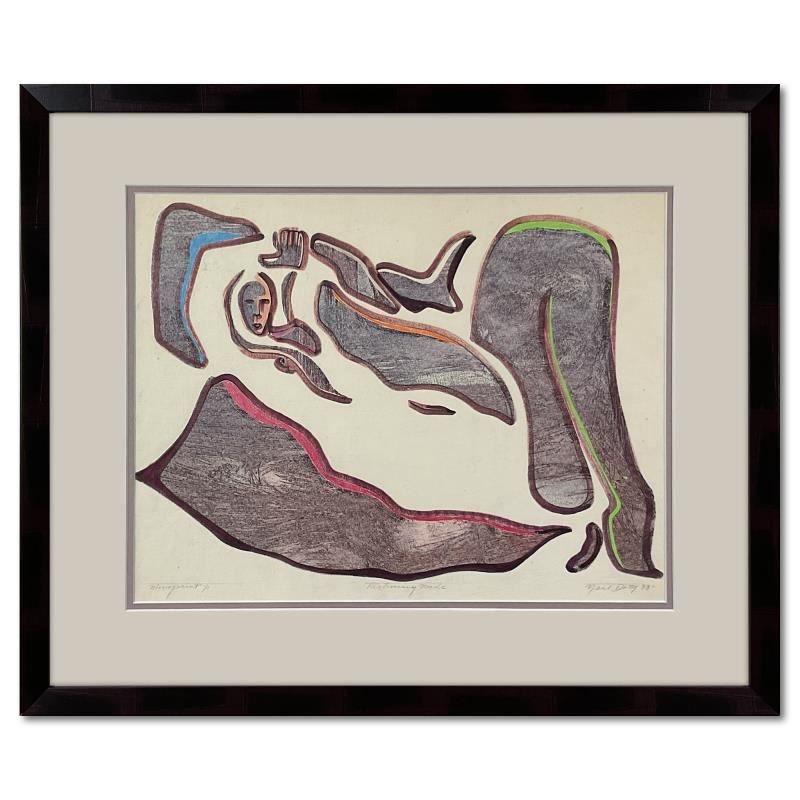 "Reclining Nude" is an original hand colored monoprint on paper by Neal Doty (1941-2016), dated 1973, numbered 1/1 and hand signed by the artist. This piece comes custom framed. Includes Letter of Authenticity. Measures approx. 25.5" x 21.5" (frame), 18" x 14" (image).