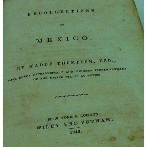 Waddy Thompson, Esq., late envoy extraordinary and minister Plenipotentiary of the United States at Mexico, published in 1846 in New York & London by Wiley and Putnam, Recollections of Mexico, 304 pages, outlines the authors trip from New Orleans to Vera Cruz, Jalapa, Puebla, meeting Santa Anna even discussing his love of Cock-fighting, and addresses The California Question. There is condition issues with the book, corners bent, some of the book sides are damaged and the spine is split but the binding is still tight to the binder and sewing holds everything together. This a first edition of an old and rare book, selling with no reserve.