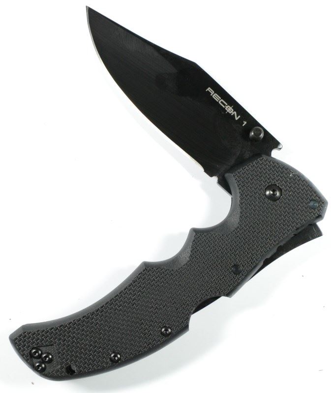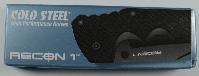 Recon 1 Cold Steel High Performance Knife. New in box. 4" black finish stainless standard edge clip blade with duarl thumb studs. Textured black G-10 handles. Features the Tri-Ad Lock. Reversible black finish stainless pocket clip. EST:$120-$140