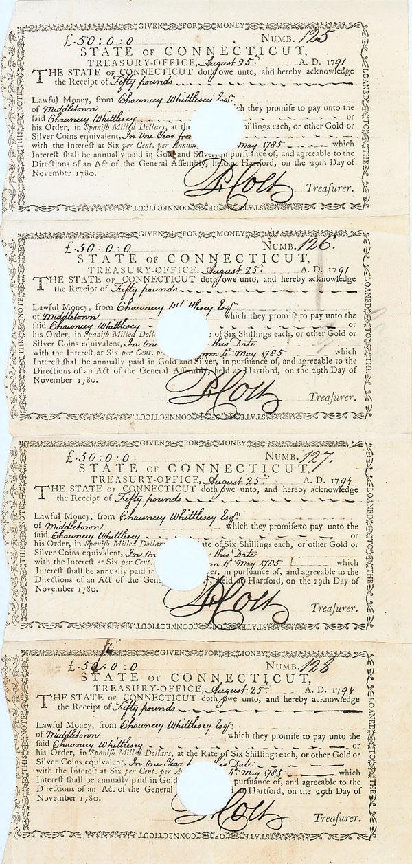 1794, Hartford, Connecticut. An interesting sheet of four consecutively numbered Treasury office notes payable in Spanish Milled Dollars. All were issued to Chauncey Whittlesey and cut into separate notes and subsequently cancelled. The notes have been reconstructed back into the original sheet and are lightly tipped together with glassine. All signed by PETER COLT. An interesting and seldom seen view of the original complete sheet. Extremely Fine.