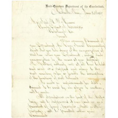 <B>Reconstruction Letter Signed by William Whipple.</B></I> One page, 7.75" x 10", Nashville, Tennessee, June 23, 1865, signed "<I>Wm D. Whipple"</B></I> on reverse. This letter, containing important Reconstruction content, was sent to Major General Henry Slocum, directing him to enforce the proper conduct of those under his command. Among the special instructions included in this letter is the order that <I>"</B></I>[a]<I>ll depredations on the part of the Military will be suppressed at once".</B></I> Very good condition with some minor foxing present, and some archival tape applied to several small tears.<BR><BR><b>Shipping:</b> Flat Material, Small (<a target="_blank" href="http://www.heritageauctions.com/common/shipping.php">view shipping information</a>)