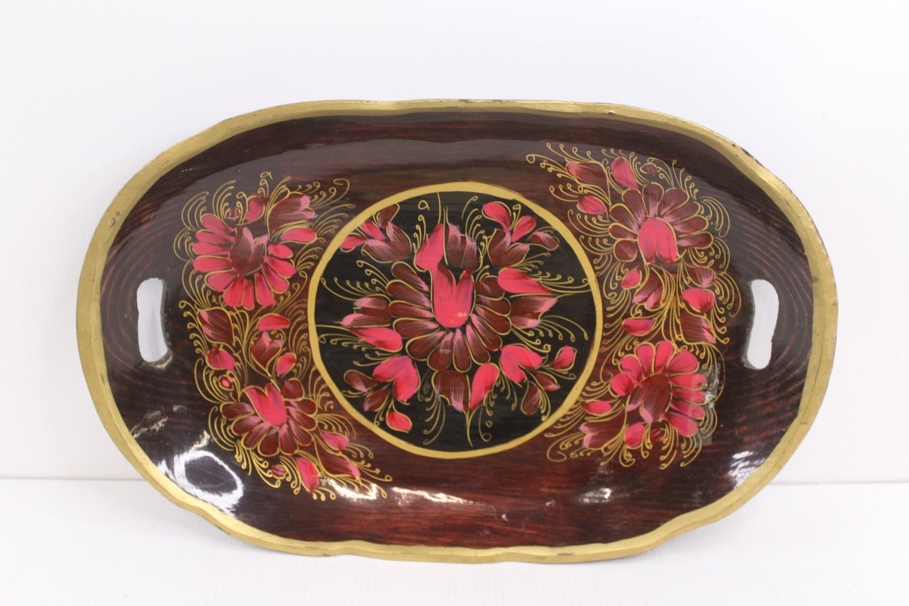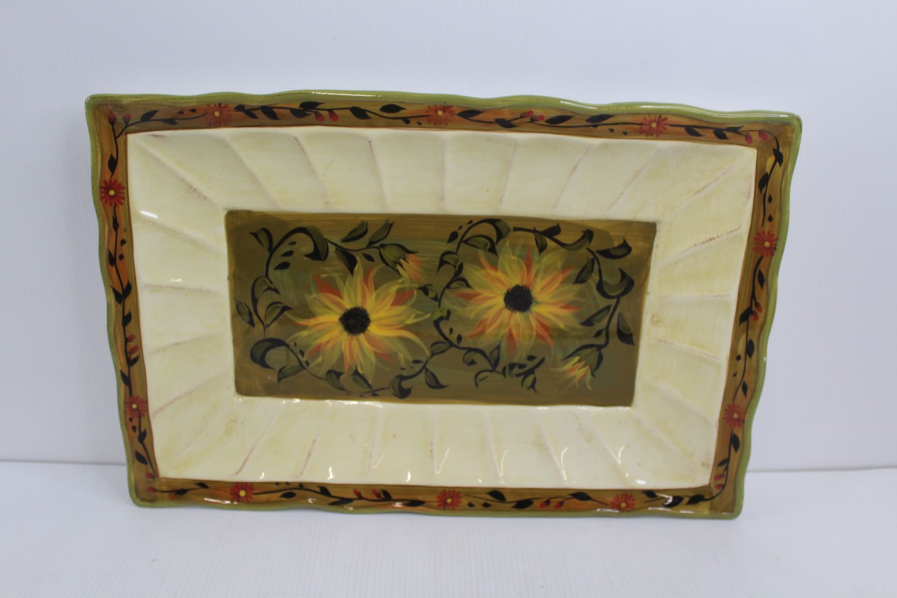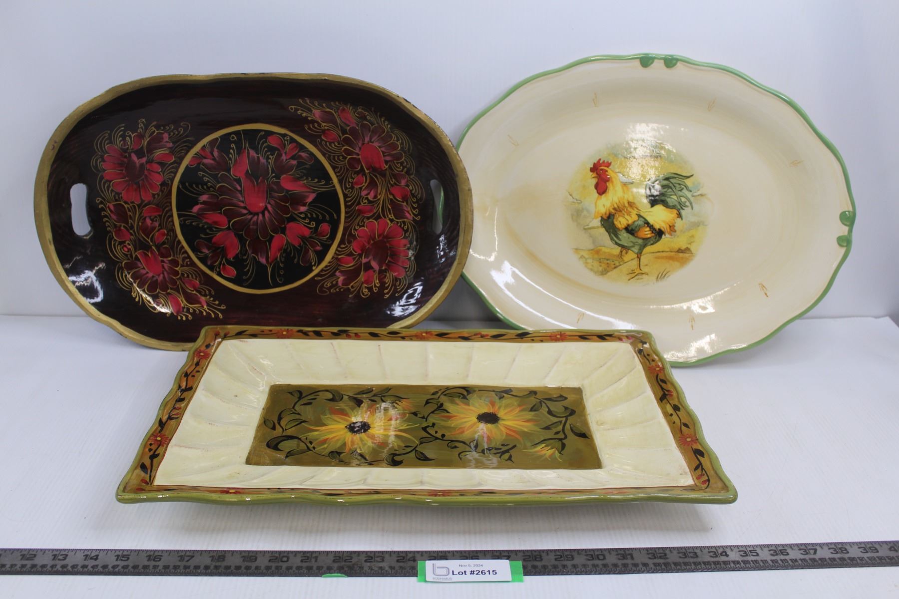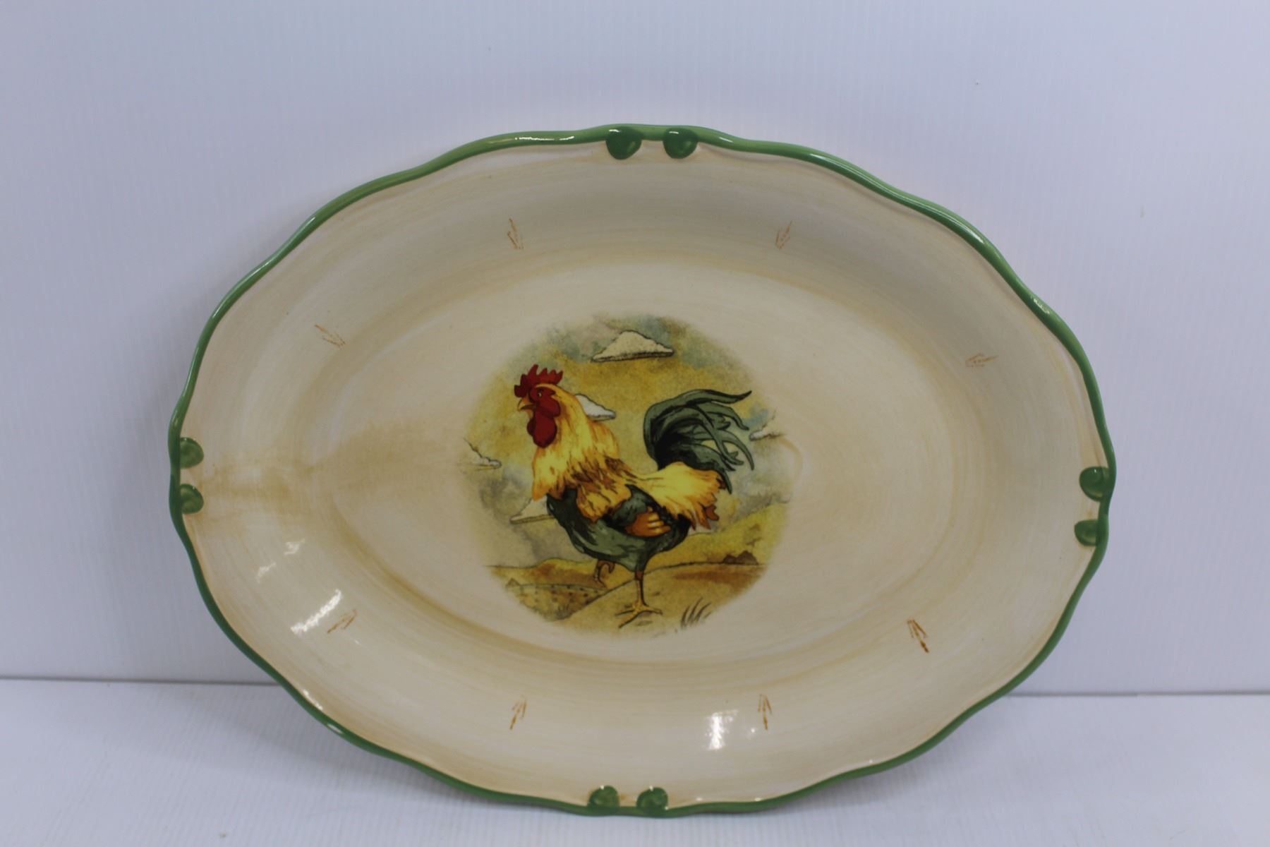 Rectangle Ceramic Platter 20"x13", Round Wooden Platter 20"x12.5", & Round Ceramic Chicken Platter 1
