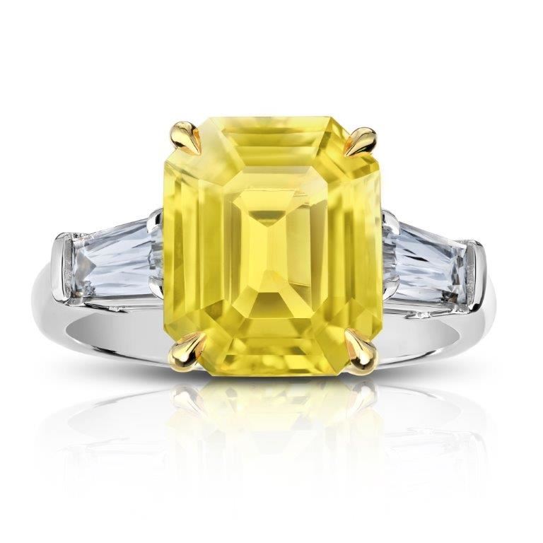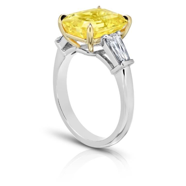 7.08 carat EMERALD CUT YELLOW SAPPHIRE AND 0.86 diamond carat weight THREE STONE CUSHION RING SET IN PLATINUM AND 18K YELLOW GOLD