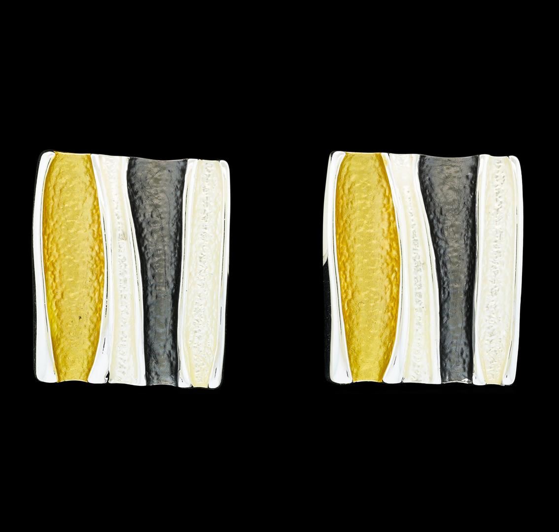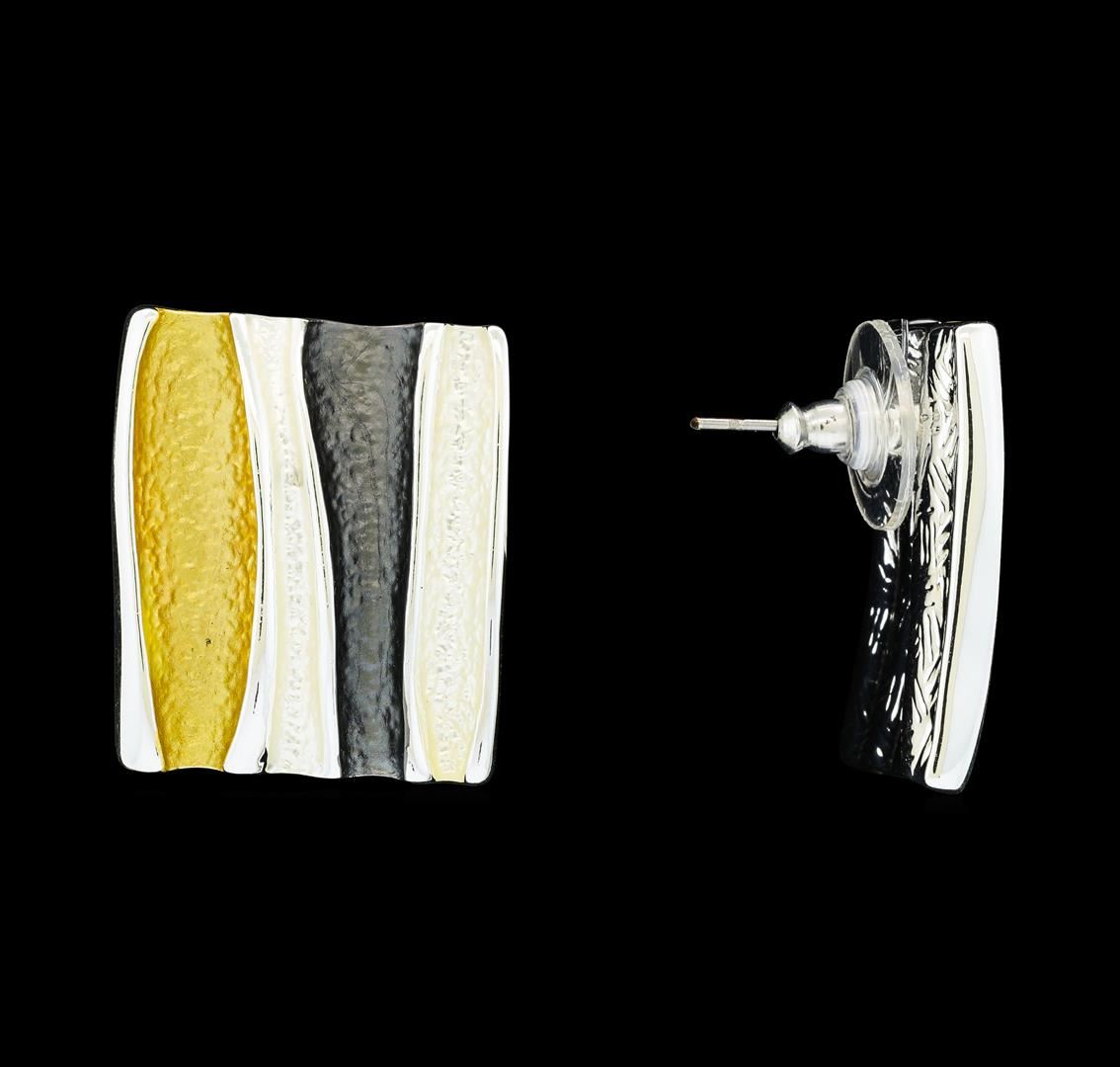 High end designer jewelry. Rectangle Earrings - Rhodium Plated. Rhodium Plated Post Set. Tricolor/ Slv. 0.8x1inch. Total Weight: 12.7 grams.