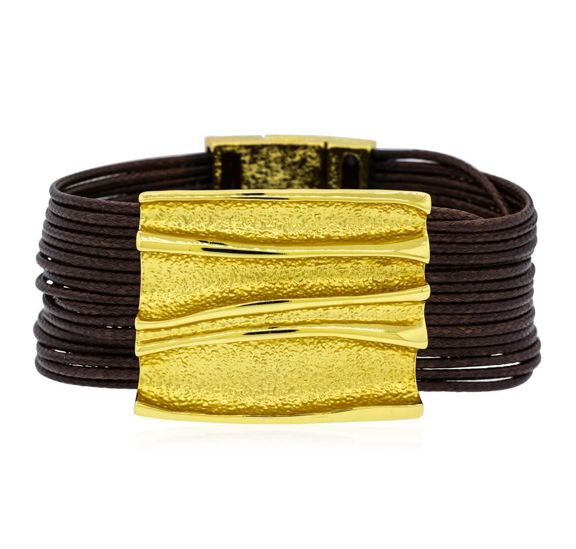 High end designer jewelry. Rectangle Pendant Multi Strand Bracelet - Gold Plated. Gold Plated/ Mag Clasp. Gold/ Brown. 7.5inches. Total Weight: 49.7 grams.