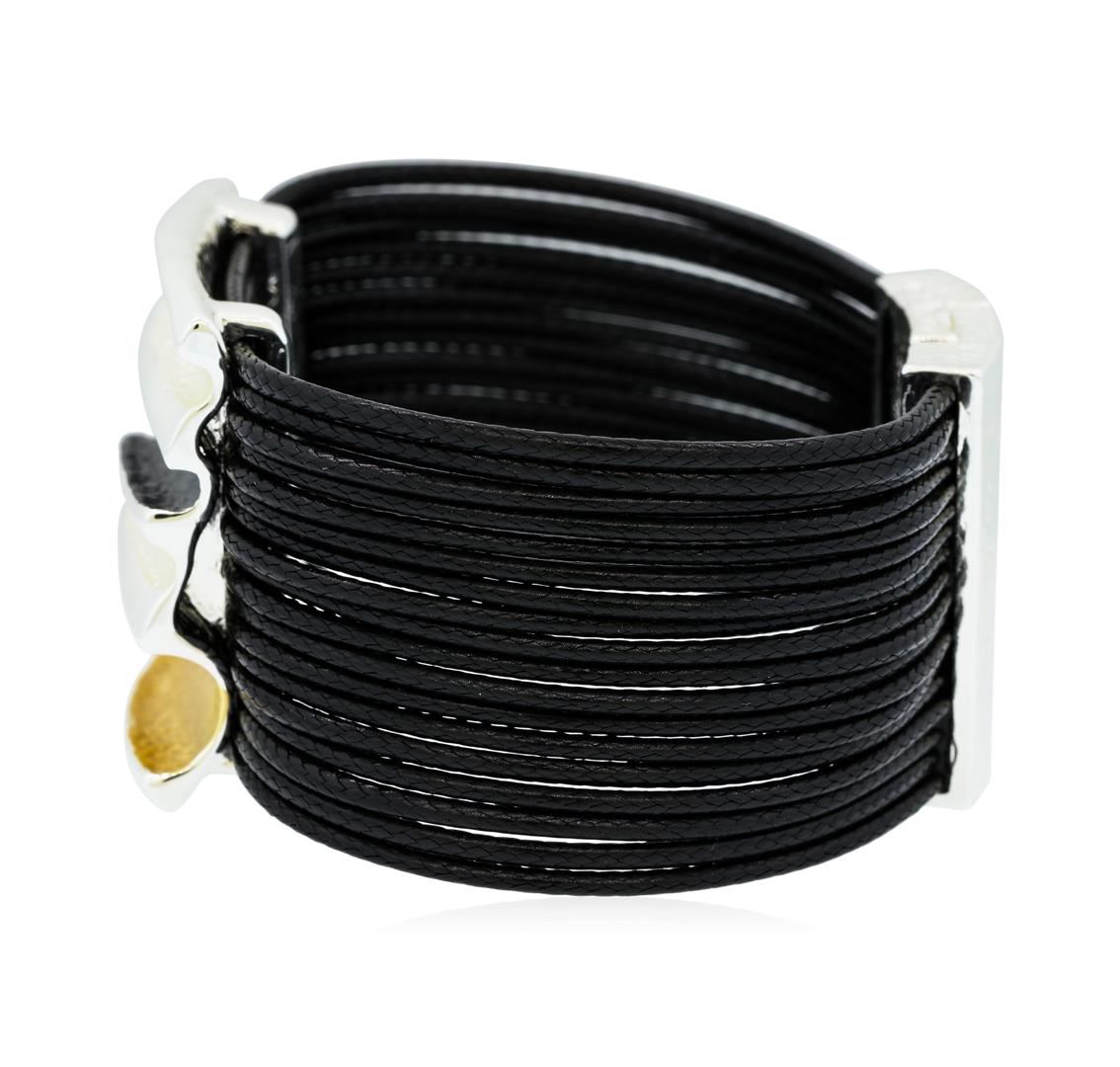 High end designer jewelry. Rectangle Pendant Multi Strand Bracelet - Rhodium Plated. Rhodium Plated/ Mag Clasp. Tricolor/ Blk. 7.5inches. Total Weight: 47.7 grams.