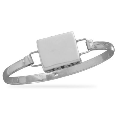 Bangle is 5mm wide and features 18x22mm engravable rectangle and hook clasp. .925 Sterling Silver