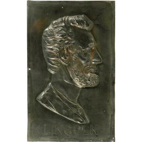 <B>Rectangular Lincoln Relief Profile Plaque.</B></I> This piece measures 8" wide x 12.75" tall. Made of dark tin, with "LINCOLN" etched in underneath the profile. "Made in Germany" stamped into the the bottom front of the tin. This piece is good, with some wrinkling to the tin, and a 2.25" crack just beneath Lincoln's chin, extending into the neck. Still an attractive piece for any Lincoln lover.<BR><BR><b>Shipping:</b> Miscellaneous Collectibles, Smal (<a target="_blank" href="http://www.heritageauctions.com/common/shipping.php">view shipping information</a>)