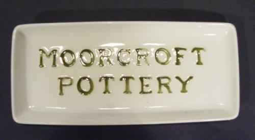 Rectangular Moorcroft Pottery advertising tray with green painted and tube lined lettering, factory
