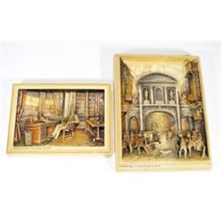 Rectangular Osborne plaque 'Temple Bar in Dr Johnsons time' and 'Charles Dickens in his study', marks to back, largest 25cm high