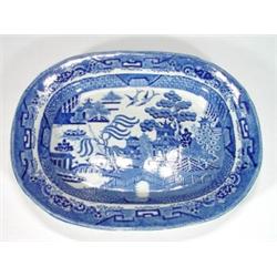 Rectangular Victorian stone china meatplate decorated with blue and white transfer printed willow pattern, 42cm in length