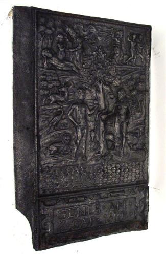 Rectangular cast iron fire back, decorated with a scene of Adam and Eve in the Garden of Eden, 78cm high