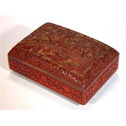 Rectangular red lacquer box with chinoiserie scenes and with blue enamelled interior, 16cm in len…