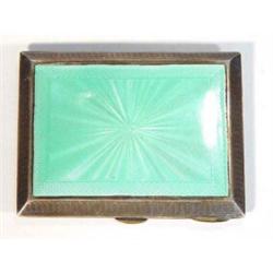 Rectangular silver and green enamel silver cigarette case with engine turned decoration, Birmingham, 1927