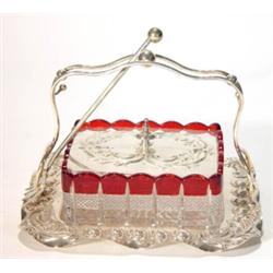 Rectangular silver plated red and clear cut glass sardine dish and fork