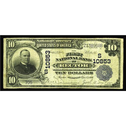 <B>Rector, AR</B></I> - $10 1902 Plain Back Fr. 632 <B>The First NB</B></I> Ch. # (S)10853<BR>A just plain rare note from the only bank to issue in this tiny Clay County community located in the extreme NE section of the state. This piece is new to the census, a listing that now consists of just four large examples, with this as nice as any previously recorded. <B>Fine.</B></I>