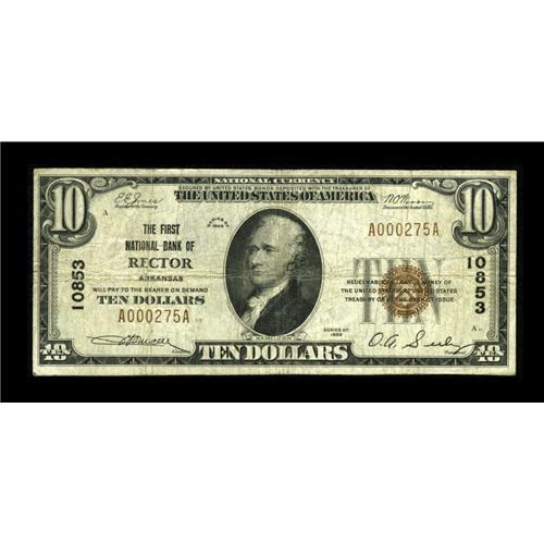 <B>Rector, AR</B></I> - $10 1929 Ty. 1 <B>The First NB</B></I> Ch. # 10853<BR>A just plain scarce bank which had a miniscule small size issue before it entered receivership in December of 1930. Nice <B>Fine+,</B></I> and scarce enough to see bidding reach or exceed...<BR><BR><b>Shipping:</b> Coins & Currency (<a target="_blank" href="http://www.heritageauctions.com/common/shipping.php">view shipping information</a>)