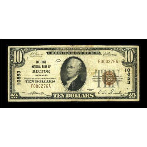 <B>Rector, AR</B></I> - $10 1929 Ty. 1 <B>The First NB</B></I> Ch. # 10853<BR> A just plain scarce bank which had a miniscule small size issue before it entered receivership in December of 1930. <B>Fine,</B></I> easily desirable enough to see bidding reach or exceed...<BR><BR><b>Shipping:</b> Coins & Currency (<a target="_blank" href="http://www.heritageauctions.com/common/shipping.php">view shipping information</a>)