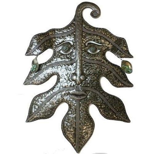 Recycled Steel Drum Art - Green Man Design - Croix des **|**|** This Green Man mask design metal wall art features utensils with marbles as earrings and marble eyes. It is handmade from recycled steel drums in Haiti and signed by the artist Lurernier. Measures 24 by 18 inches. Suitable for indoor or outdoor hanging. #HMDLEAF