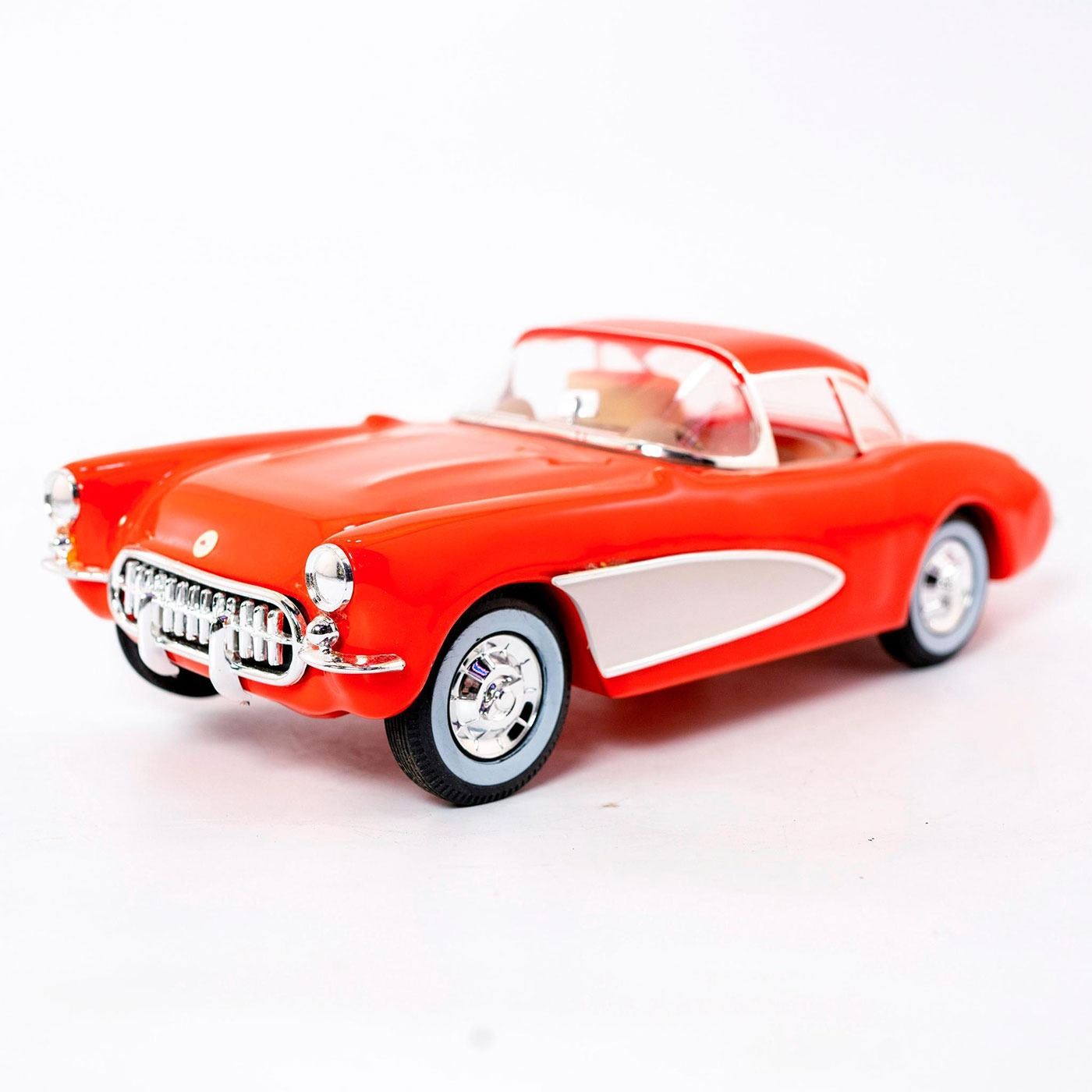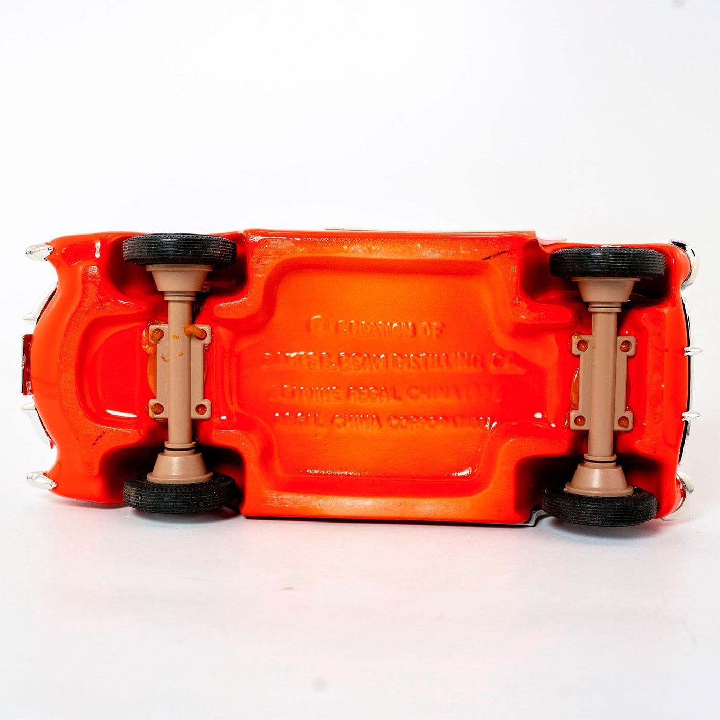 Porcelain undercarriage. Red glossy finish, tan interior, and white accents on sides. Alcohol not included. Comes with original box. Automobilia and Americana