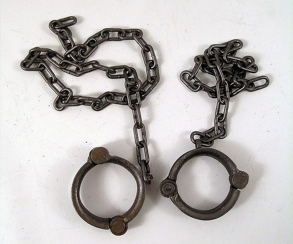 Screen used, hero, heavy very worn and aged metal hand cuffs.