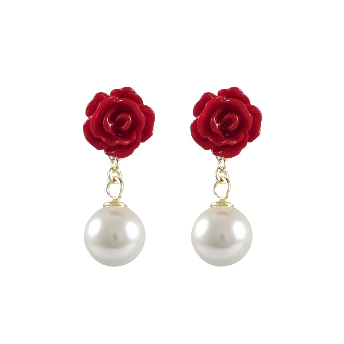 Red 6.5Mm Rose Flower With 5.5Mm White Pearl Dangling, Gold Plated Sterling Silver Post Earrings