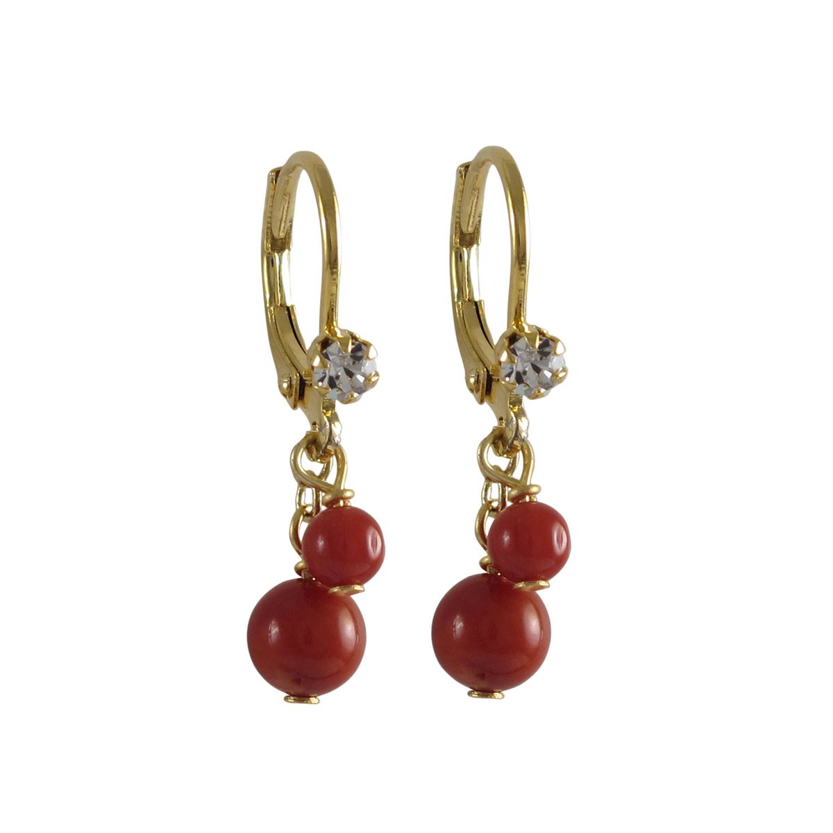 Red 6Mm And 4Mm Semi Precious Balls Dangling, Gold Plated Surgical Steel Lever Back With White Crystal Earrings, 1.02"