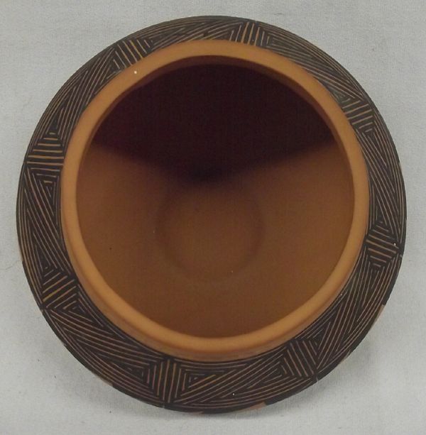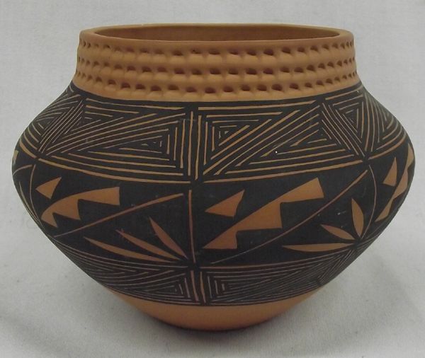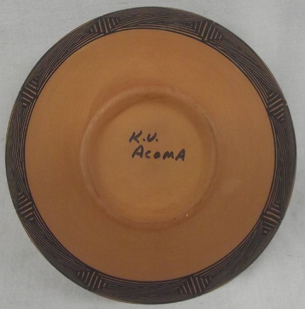 From the Collection of Nick & Suzanne Nicholas comes this impressive Red Acoma Pottery Bowl signed KV (Kim Vallo) Artist Info: This work of art was created by Kim M. Vallo of the Acoma Pueblo. Kim was born on 10/17/1968 into the Red Corn and Small Oak Clans. She was taught her craft by Simon & Marie Vallo(Parents) and brother Leland R. Vallo. She specializes in fine line and eye dazzler jars, bowls, Wedding Vases, large Ollas and miniatures. Her favorite designs are starburst and feathers in a row. She has been hard at work for 24 years and signs his pieces Kim Vallo Acoma NM. Standing Approx. 4'' high it is 7.5'' in diameter at it's widest. It has black geometric designs and very cleanly done.