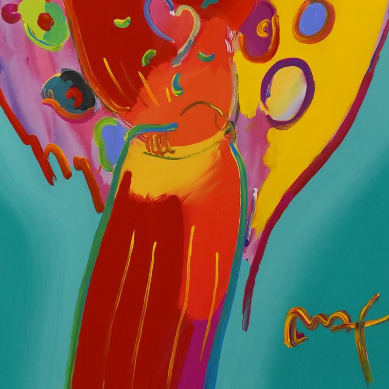 "Red Angel with Heart" is a one-of-a-kind acrylic mixed media on paper, hand signed by Peter Max. This piece comes custom framed. On the reverse side of this piece there is a registration number (260893) from Peter Max Studios certifying authenticity. Measures approx. 33.5" x 45.5" (with frame), 23" x 35" (image).