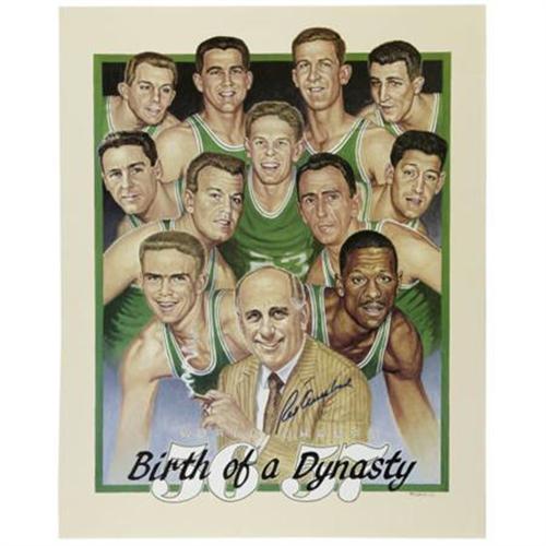 <B>Red Auerbach Signed Boston Celtics Poster.</B></I> Named the greatest coach in the history of the NBA by the Professional Basketball Writers Association in 1980, Auerbach was a highly successful coach and front office executive for the Boston Celtics. Pictured on the print with his trademark cigar, Auerbach's compact and concise signature in blue sharpie embellishes the print. <I>LOA from PSA/DNA.</B></I><BR><BR><b>Shipping:</b> Flat Material, Large (<a target="_blank" href="http://www.heritageauctions.com/common/shipping.php">view shipping information</a>)