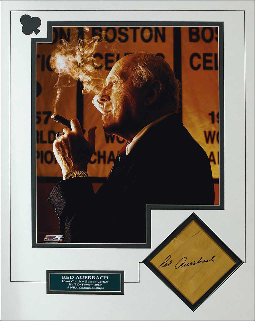Wooden basketball floorboard section, 7 x 7, signed across the center in black felt tip. Double matted with an oversized color photo of Auerbach smoking a cigar, and a name plaque, to an overall size of 22 x 28. In very fine condition.