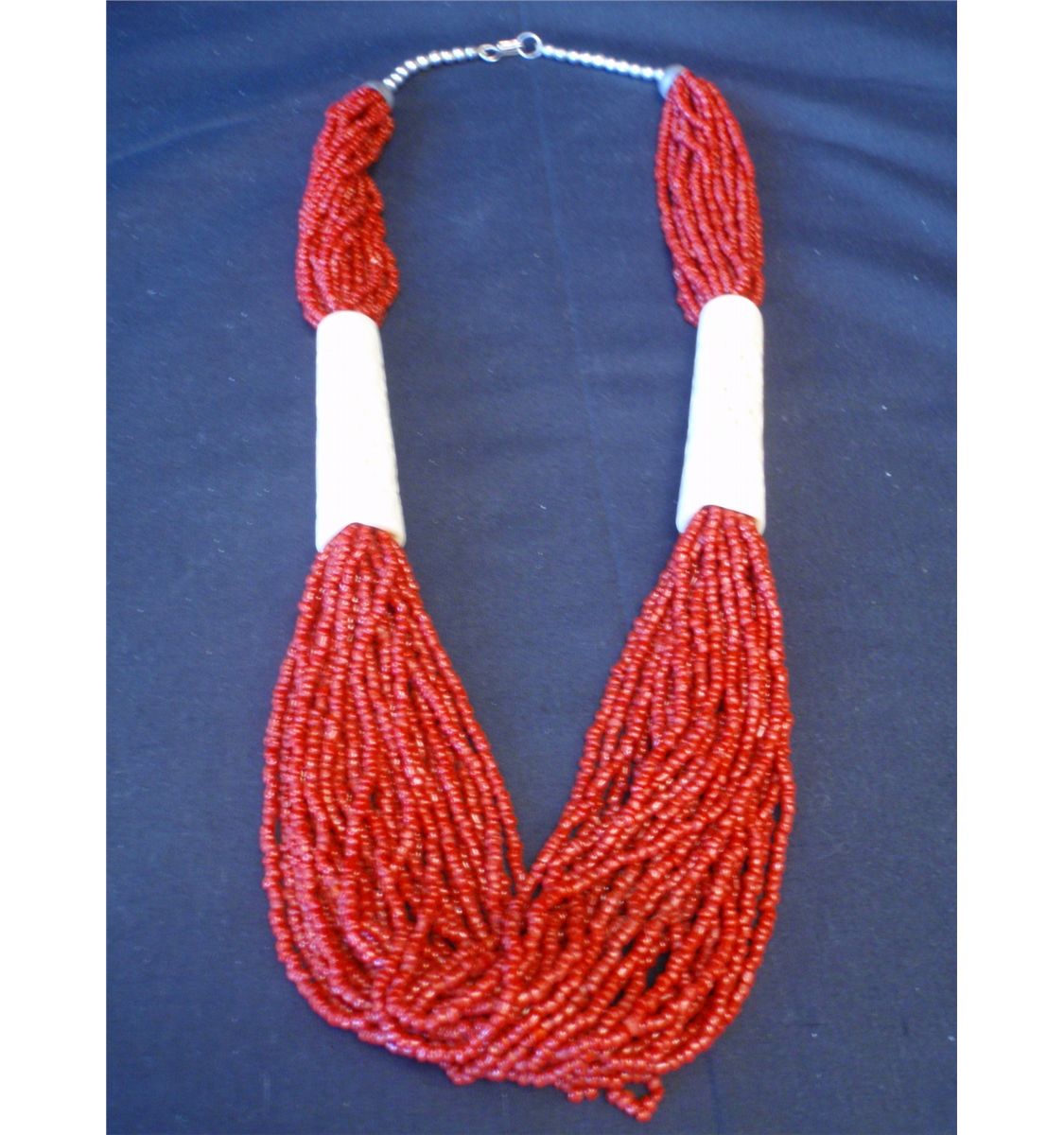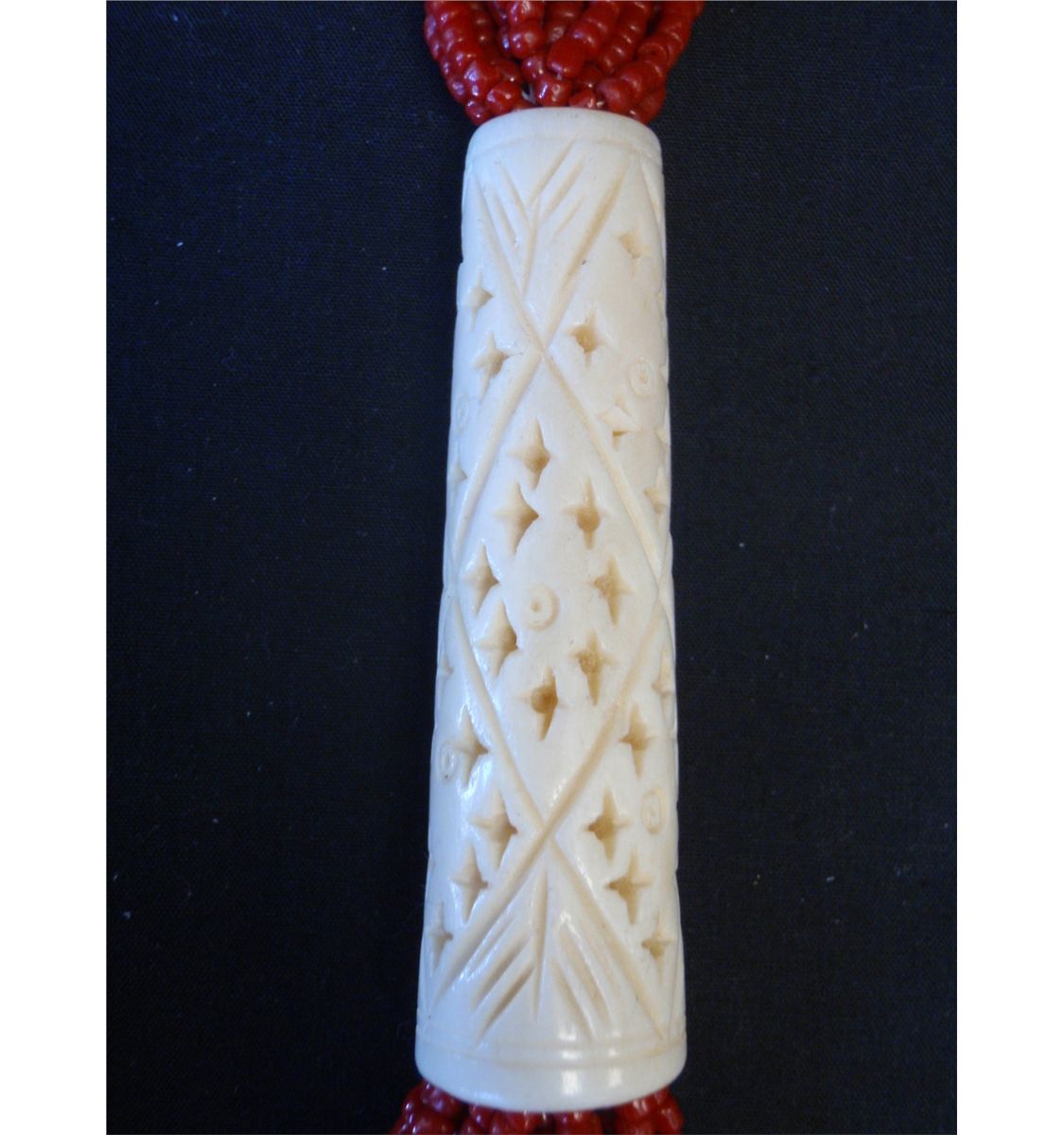 20 Strands of red beads. 30" Long with two pierced and carved bone sleeves. $10.00. Additional Shipping Charges for Lots sent outside of the U.S