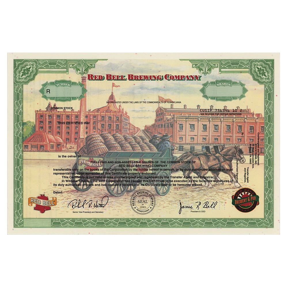 Unissued specimen stock certificate for the Red Bell Brewing Company, one page, 12 x 8, no date. The lower portion of this multicolored custom-designed certificate features “Specimen†identification holes, a 1993 corporate seal, and a facsimile signature of President and CEO James R. Bell. In fine condition.