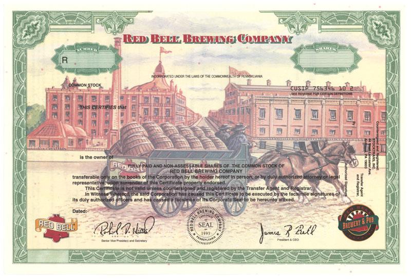 [SPECIMEN] 199-, Pennsylvania. Stock certificate specimen of the Red Bell Brewing Company. Colorful underprint of a horse drawn Red Bell delivery wagon. Red Bell logos at lower left and lower right. Green border. “Specimen” cancellations at signatures. Extremely Fine.