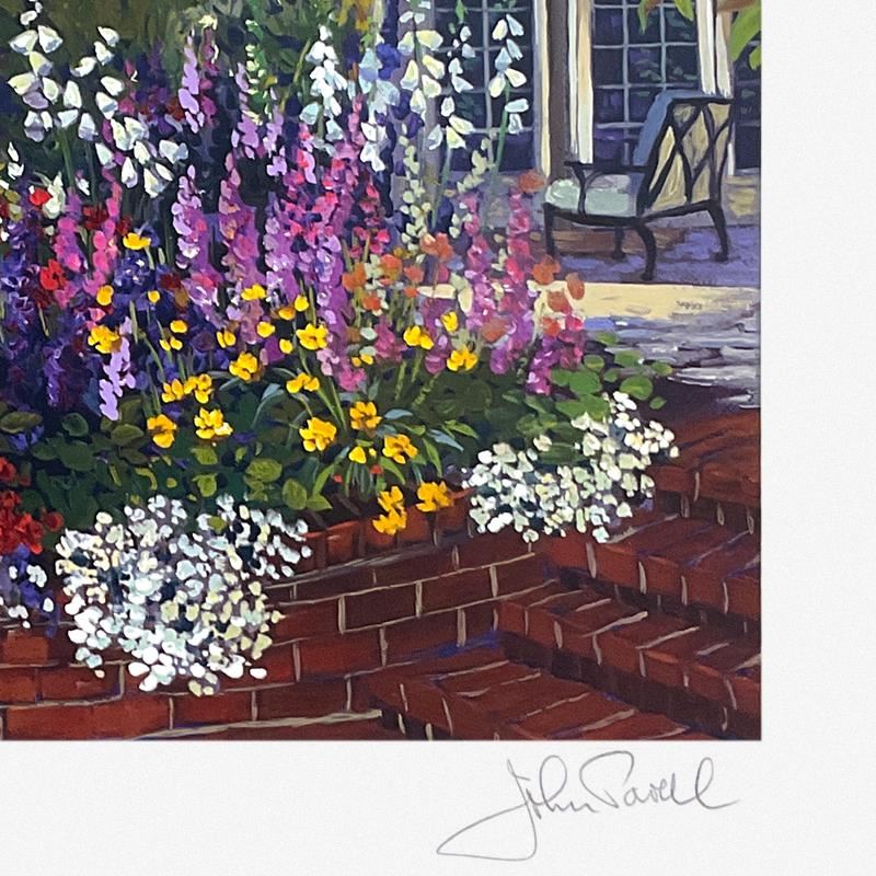 "Red Brick Garden" is a limited edition serigraph on paper by John Powell, numbered 1/21 and hand signed by the artist. Includes Letter of Authenticity. Measures approx. 13" x 14" (border), 8" x 10" (image).