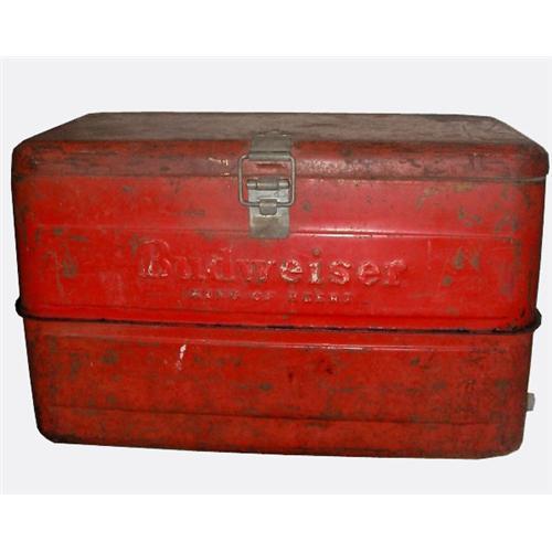 This 1940's cooler is a collector's dream. And it is pretty cool. "Budweiser King of Beers" is stamped on the front and back. Outside is painted red, inside is silver. There are handles on each side and a useful drain spout that is not found on all models. You can use this great piece as a cooler, or great decorative storage for magazines, or as a stylish side table. Either way, this is a versatile and fun item. Brought to you by Sand Hill East.