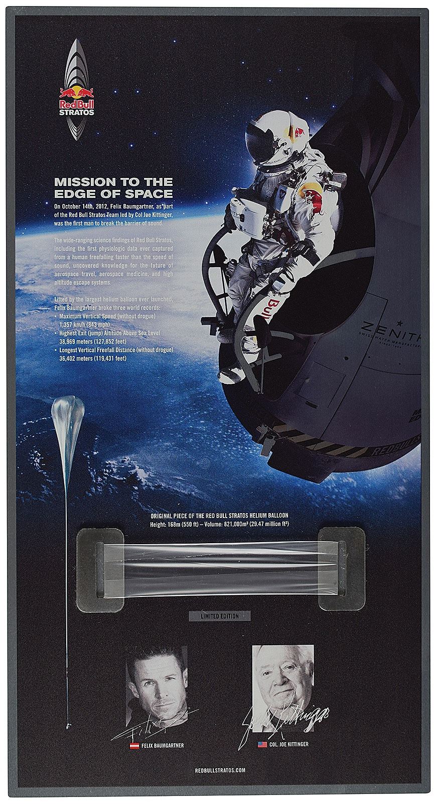 Limited edition display featuring an original piece of the Red Bull Stratos Helium Balloon that carried Austrian skydiver Felix Baumgartner 24 miles up into the stratosphere for his record-setting free fall on October 14, 2012. The piece measures 4.5? x 1? and is mounted on a metallic 8.5? x 15.75? display with images and information text on the historic feat. In very fine condition.