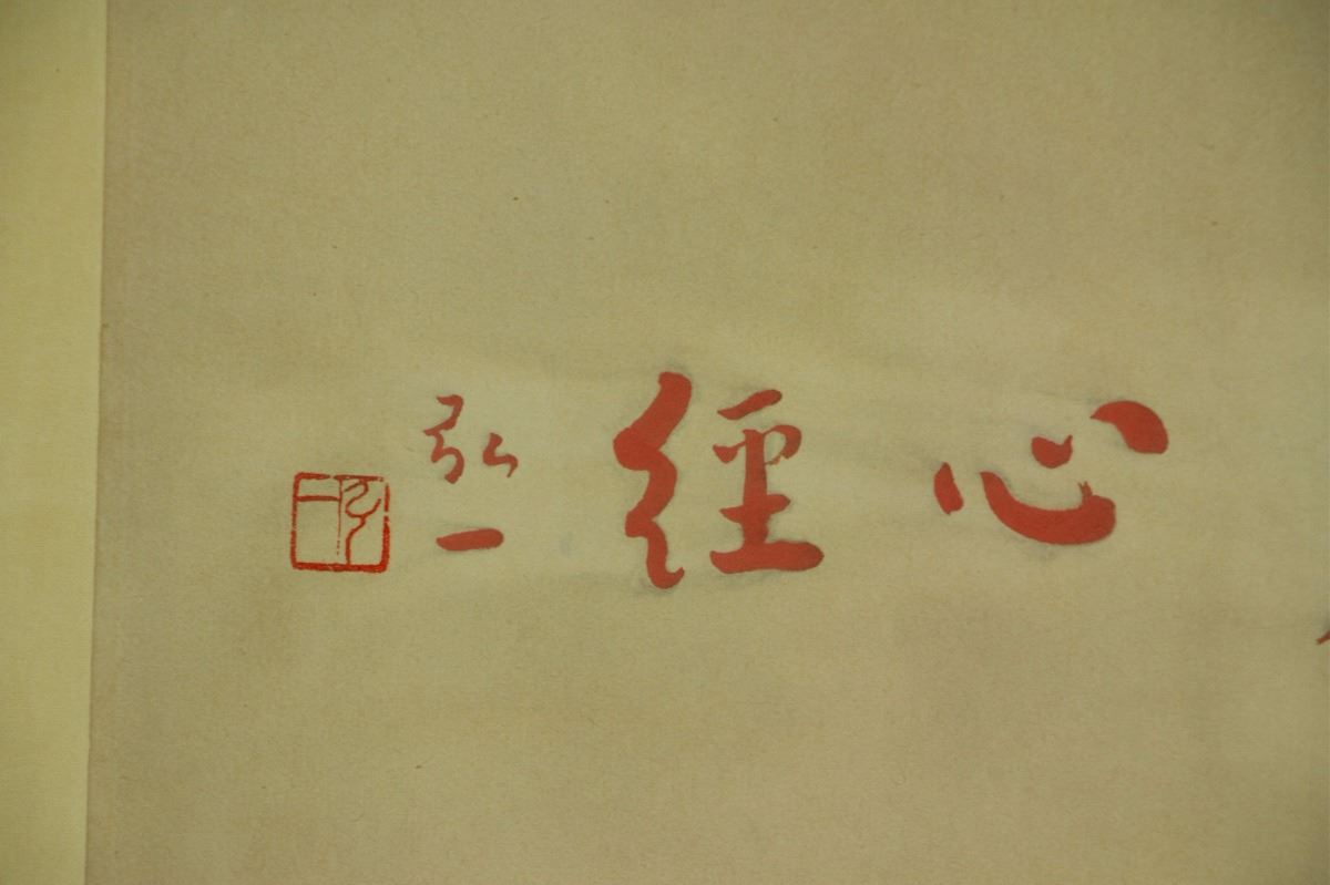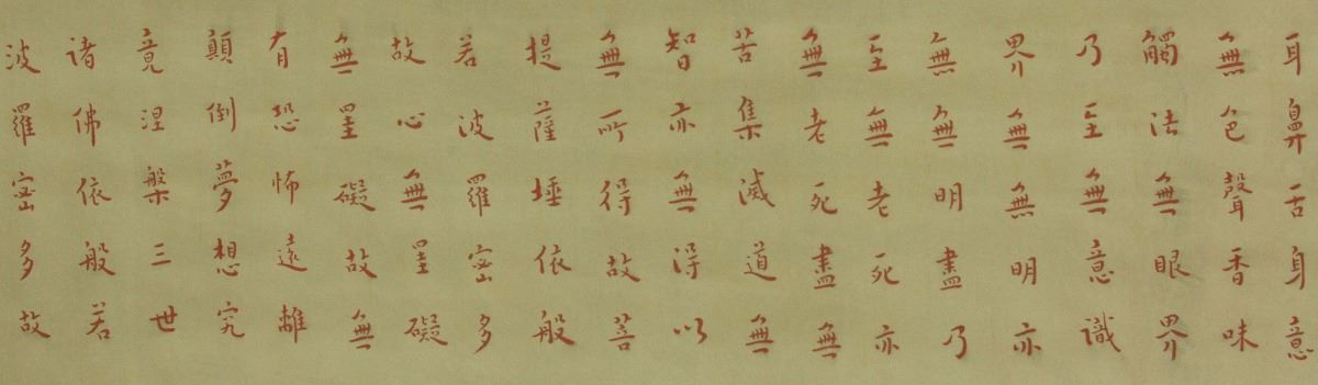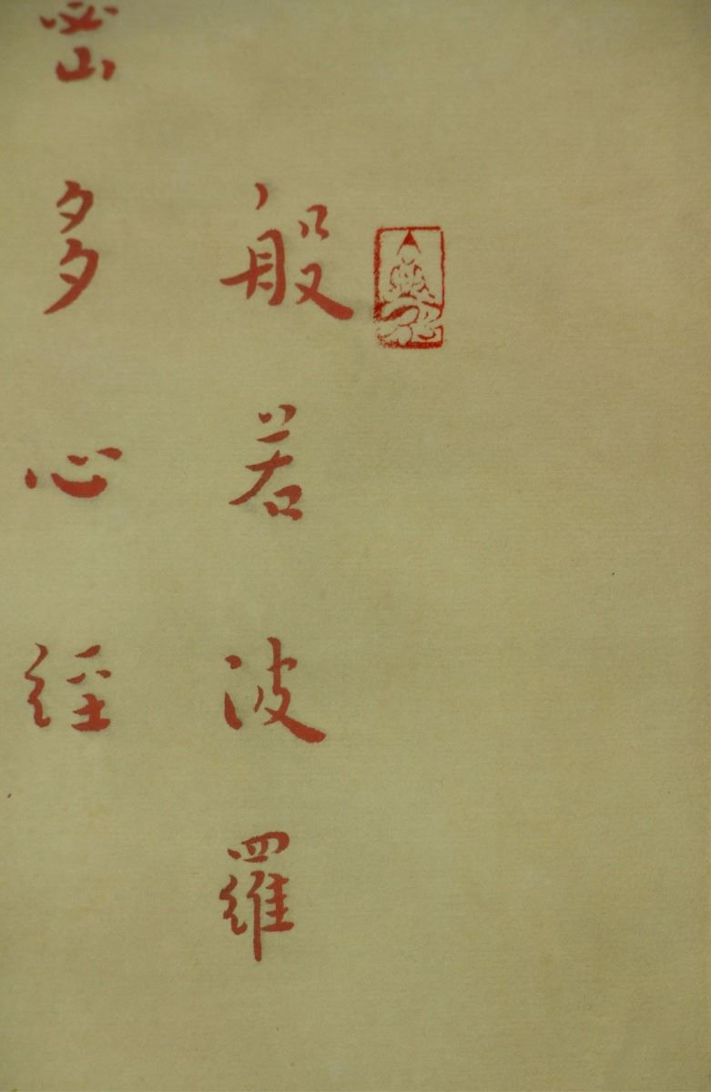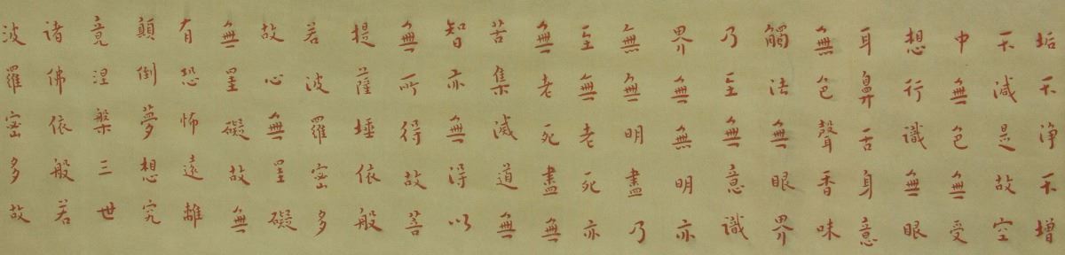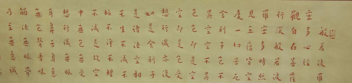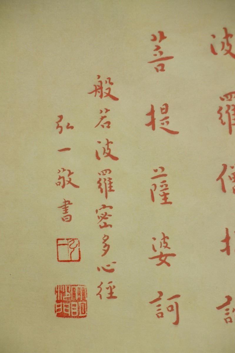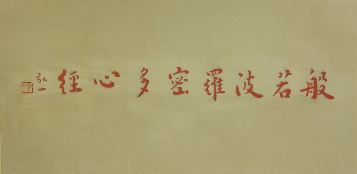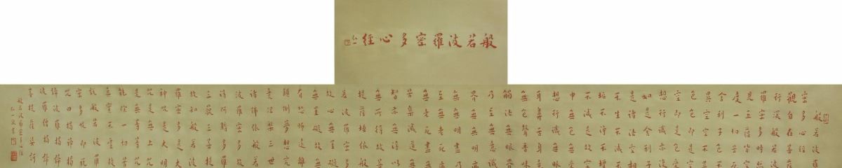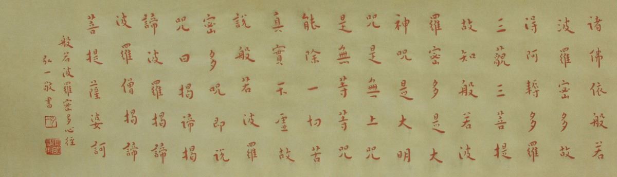 Heart Sutra; Chinese red ink on paper; hand scroll; signed Hongyi and inscribed with three artist seals; 389 cm x 26.5 cm