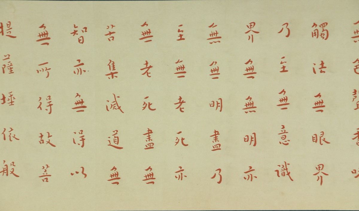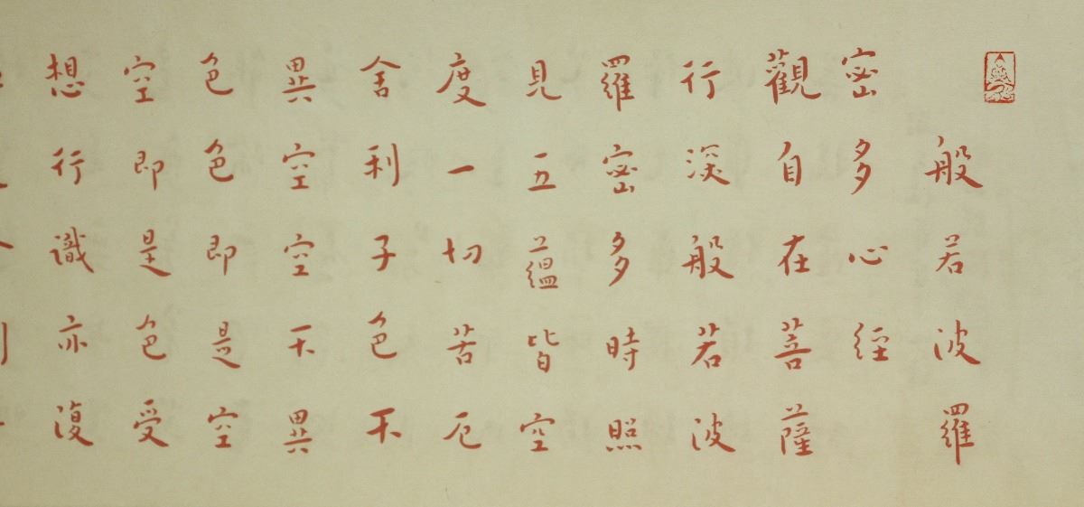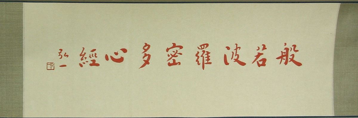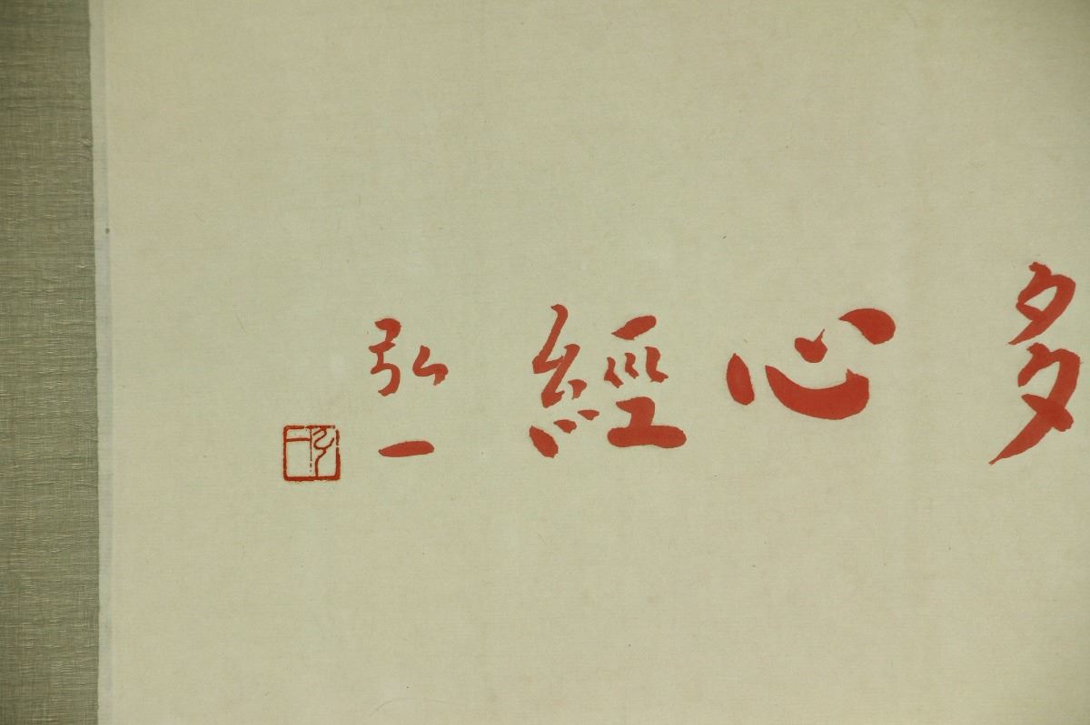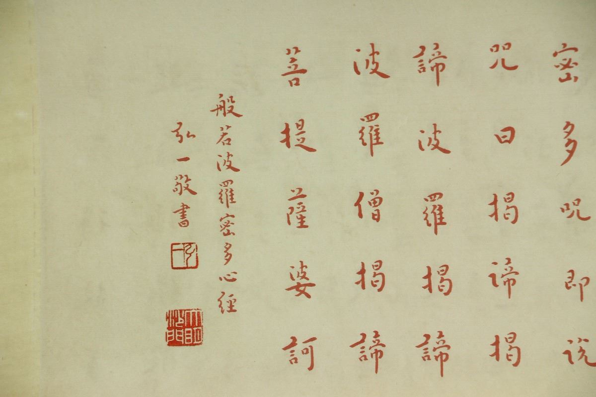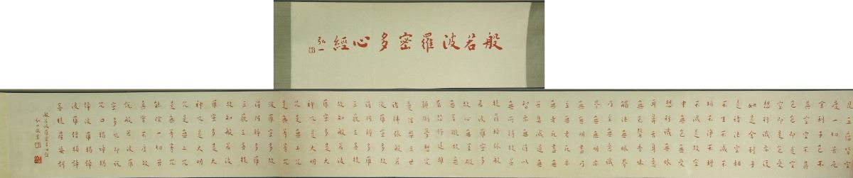 Heart Sutra script calligraphy; Chinese red ink on paper; hand scroll; signed Hongyi and inscribed with two artist seals; 409 cm × 25 cm