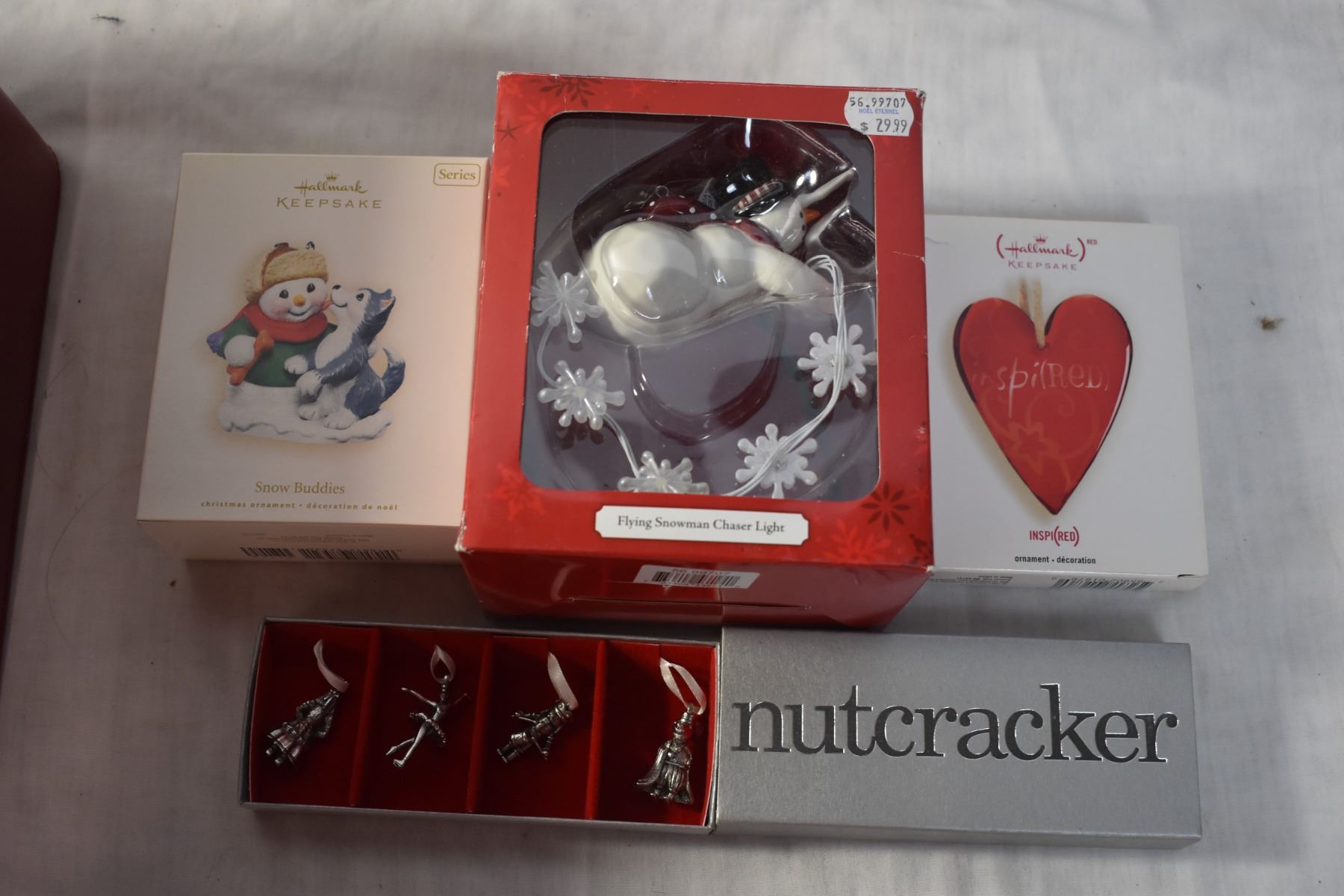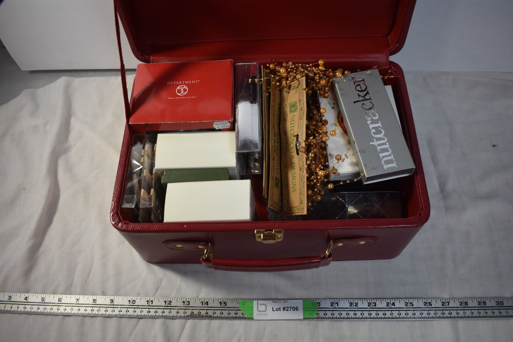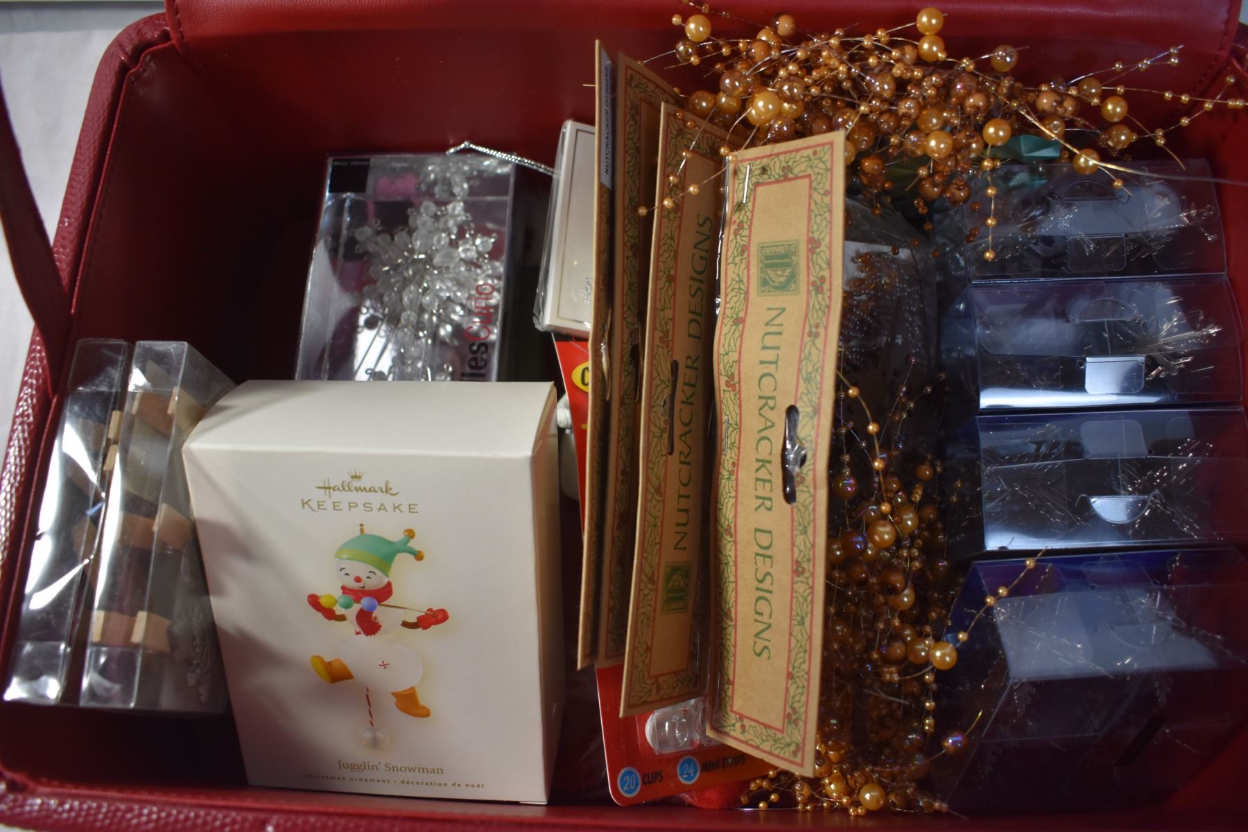Red Case Filled with Christmas Decor and Ornaments