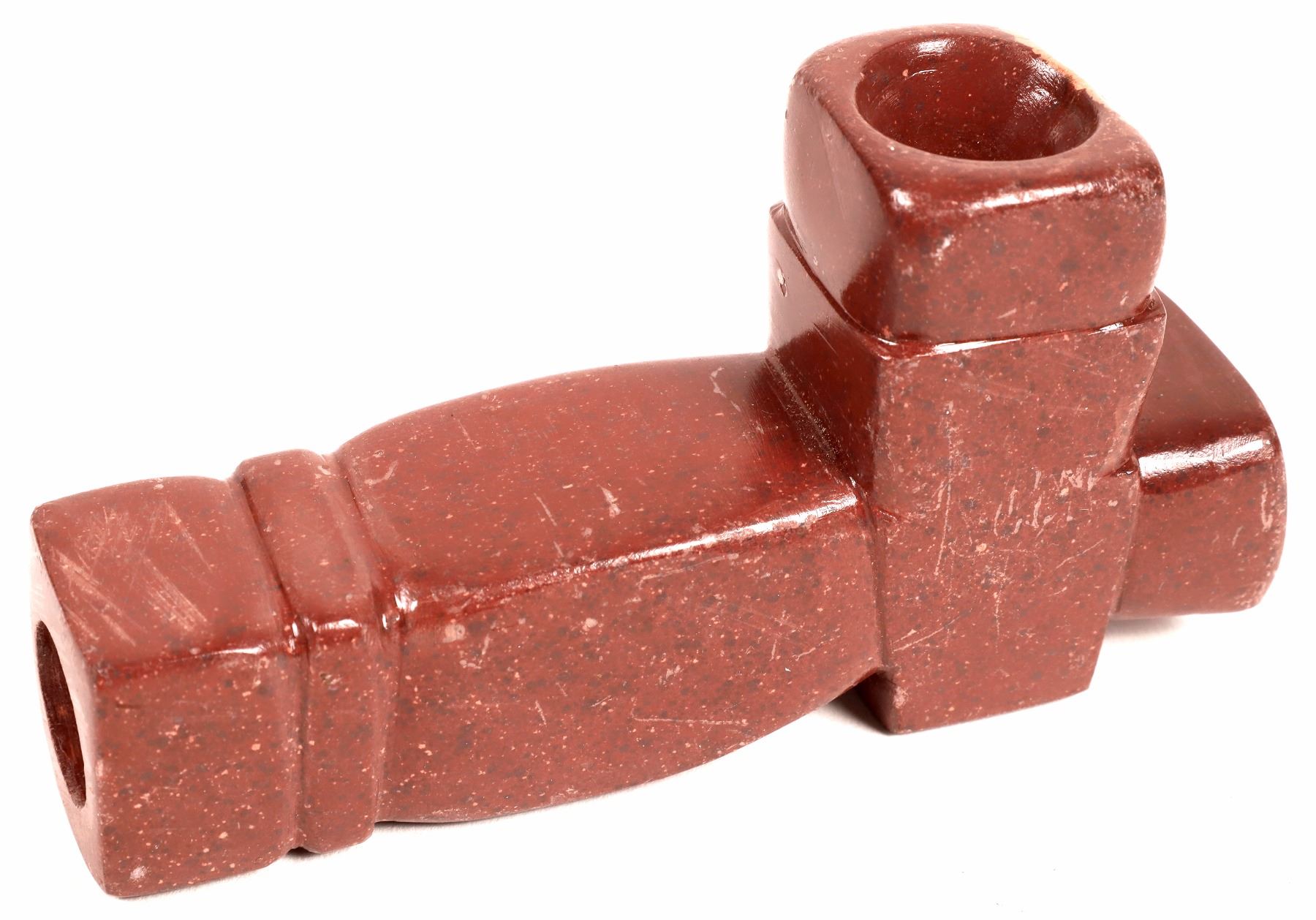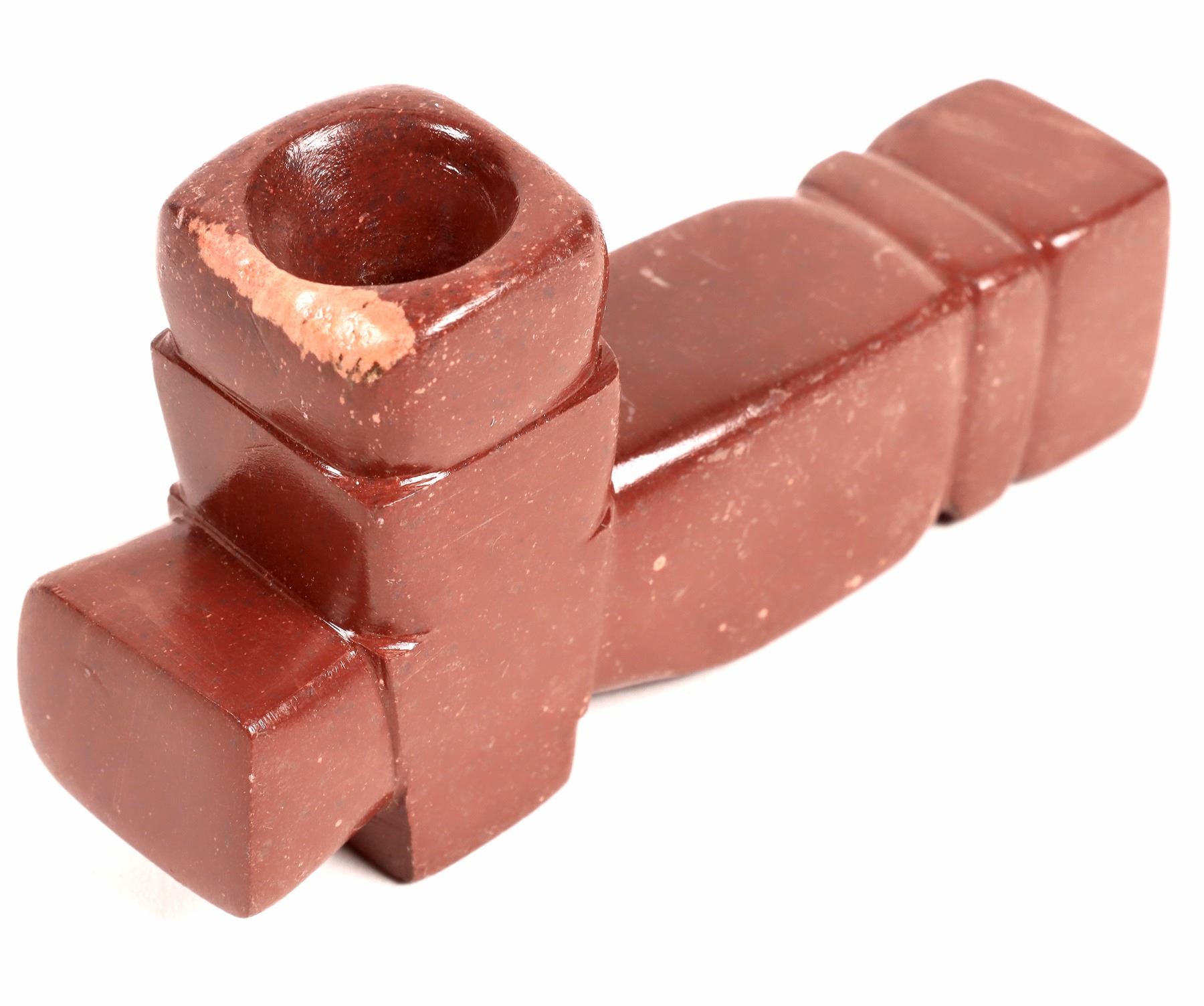 This pipestone is of catlinite mined in Minnesota. It is carved with straight edges. It is legend that warring tribes found common ground when mining at the catlinite site. 4.5 in. x 2.5 in.