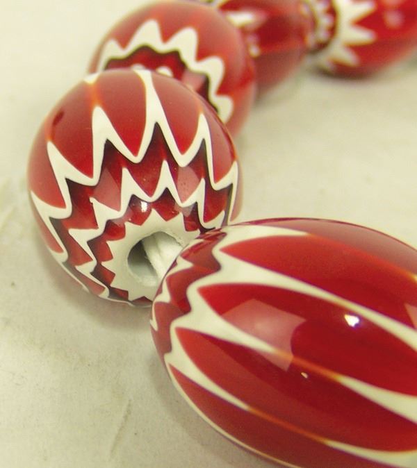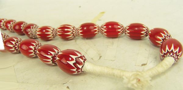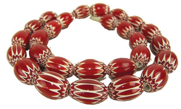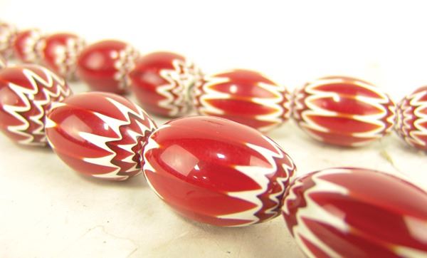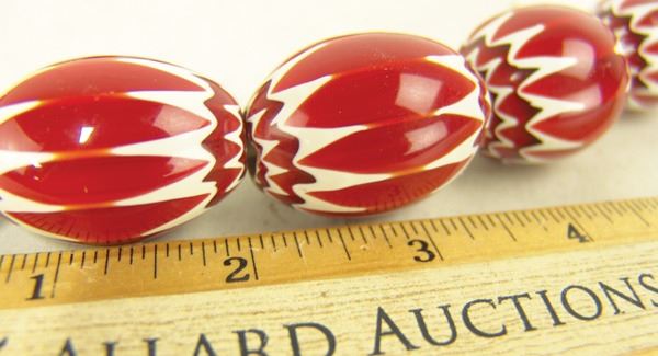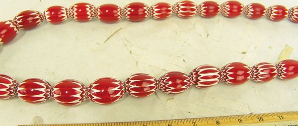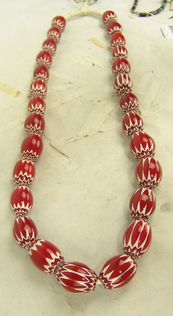 Extra long strand of 27 polished, six layer oval chevron trade beads in large 1-1/2" x 1" size. Very good condition. Hard to find these any more!Late 1900s42"