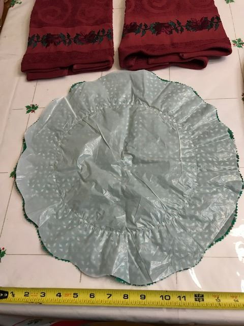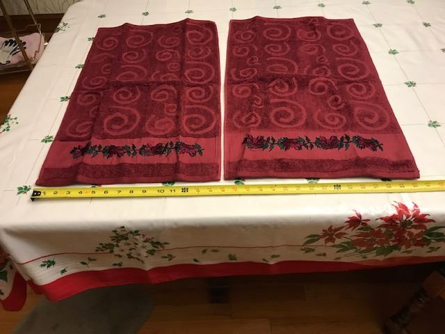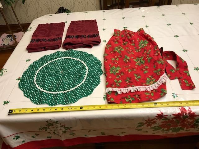 Red Christmas apron + pair wine coloured Christmas face towels, each 25.5” (65.5 cm) x 20” (51.5 cm) + Christmas plastic lined cover for dainties, 16” (41.5 cm) wide. All never used and in excellent condition.