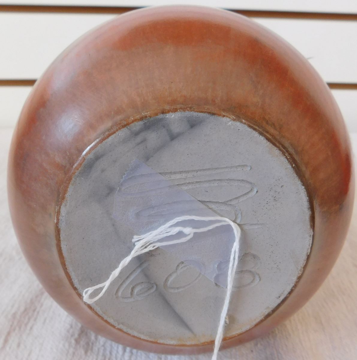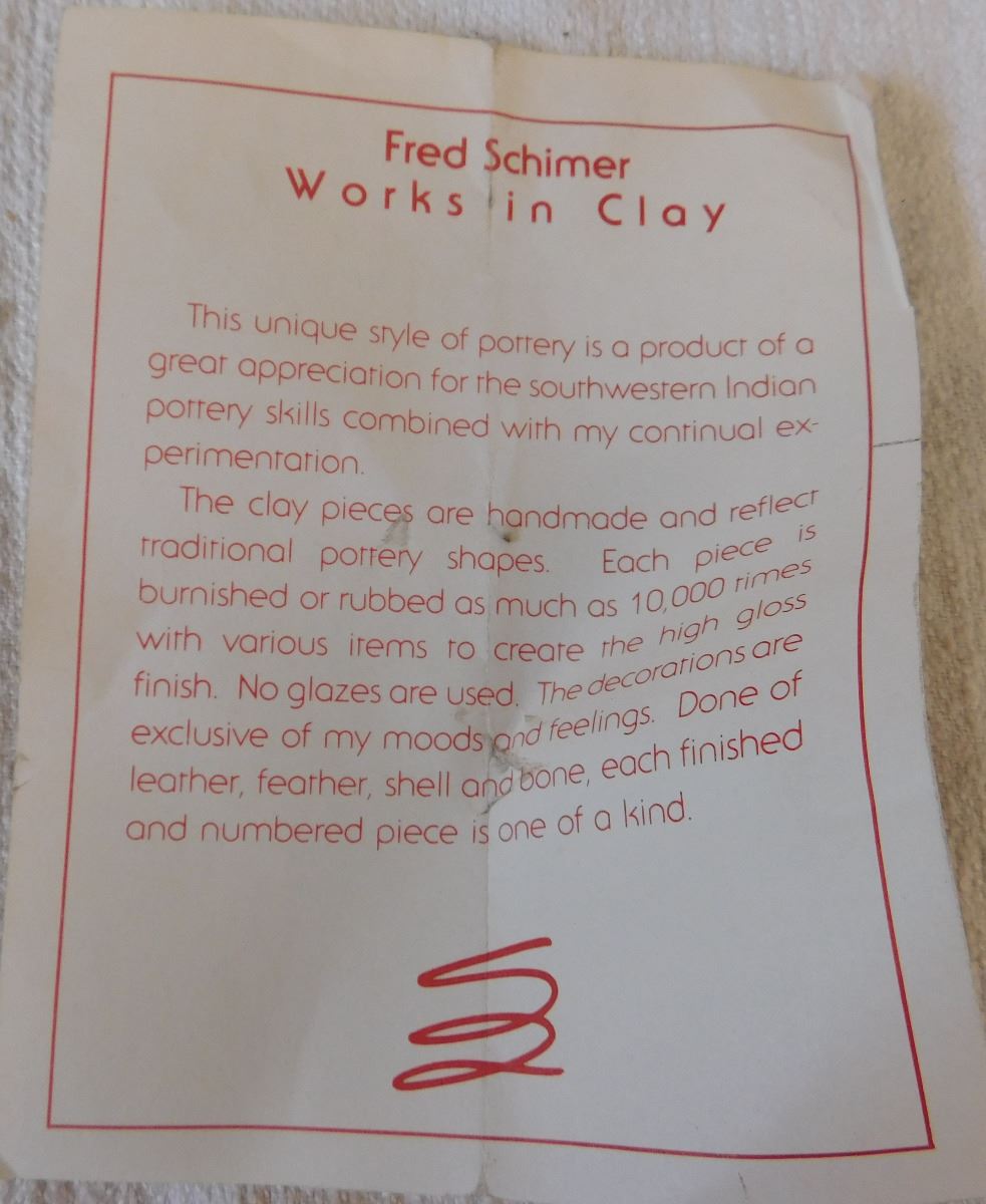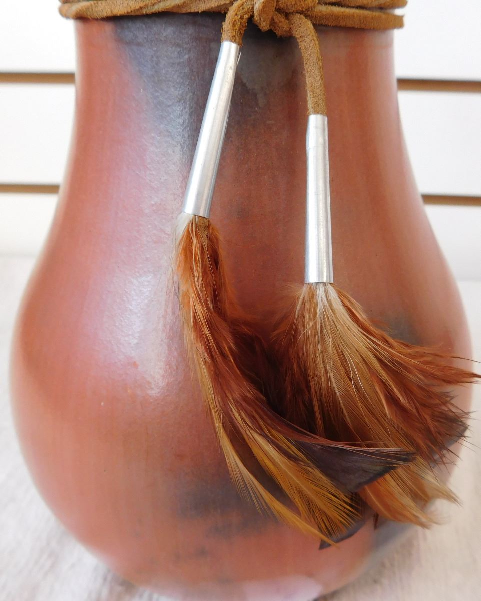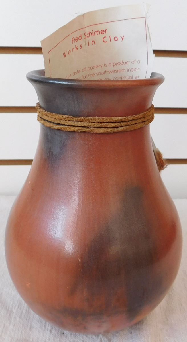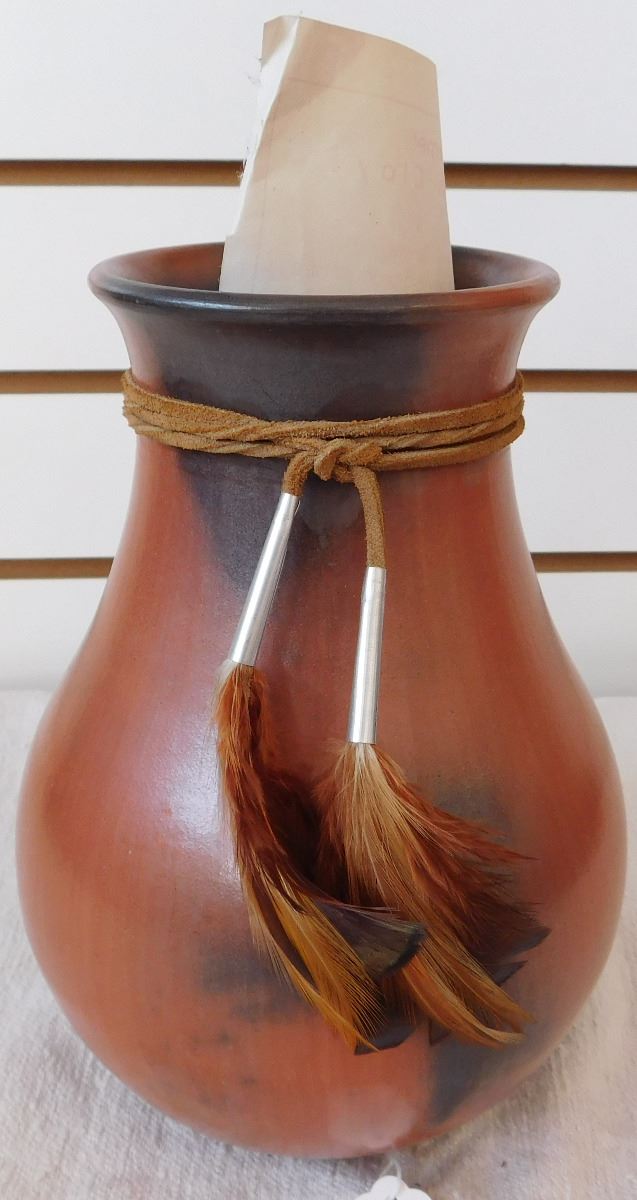 Red Clay Olla, modern item. Made of clay, leather, feathers and tin cones, this item measures 8" x 6". Fred Schimer, New Mexico. Nice southwestern style, signed 608 on bottom. Condition: Good, see images. Shipping: $27.50, requires double-box, w/insurance.