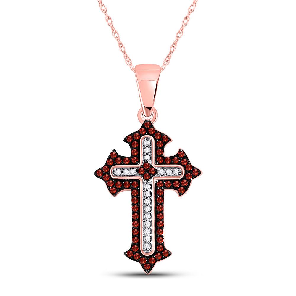 10kt Rose Gold Womens Round Red Color Enhanced Diamond Gothic Cross Pendant 1/5 Cttw
