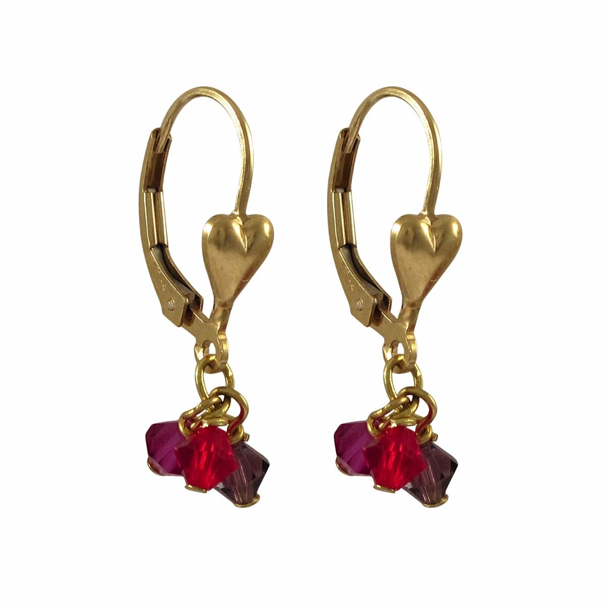 Red Combination 4Mm Swarovski Beads On Gold Filled Heart Lever Back Earrings, 0.96"