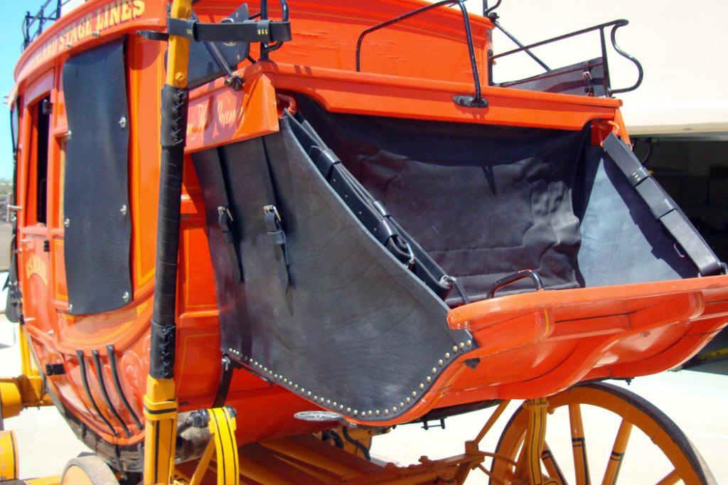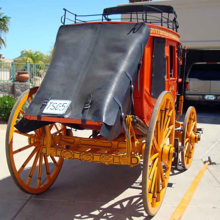 Red Concord Mail Coach made by, Frizzell Coach & Wheel Works, Oklahoma City, OK. Unknown model number, 9 passenger-inside, circa 1975. Very good-plus condition throughout. Rear boot leather has dryness cracks and some minor tears. Has older, approprimade by, Frizzell Coach & Wheel Works, Oklahoma City, OK. Unknown model number, 9 passenger-inside, circa 1975. Very good-plus condition throughout. Rear boot leather has dryness cracks and some minor tears. Has older,appropriate lamps and hitch equipment for four-up. One of the men's urinals is missing from under the front seat. In Feb 2010 all leather on rear boot, front side panels and curtains was replaced. Originally reassembled for Fritz Meyer of Lincoln City, Oregon in 1975-76. Oral history has it that Mayer took some acquired state coach parts to Frizzell to use in the construction of this coach. Mayer also requested that Frizzell install men's and ladies toilets under the two main interiorseats. Mayer provided antique bed pans for this purpose. The missing men's urinal has been missing since 1980 when Mayer brought the vehicle back to Oklahoma City. Mayer also requested that some very unusual and inappropriate scenes be paintedon the doors and that Wolverton Mountain Express be painted on the door headers. The vehicle arrived back in Oklahoma City in 1980 to be stored and protected from a bankruptcy situation in Oregon involving Mayer. The coach was stored