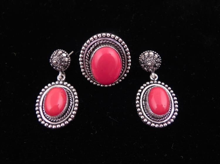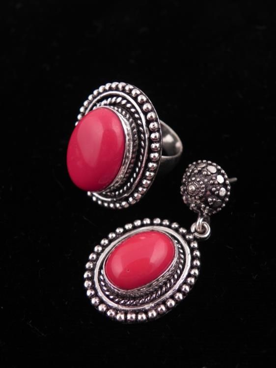 Ring & Earrings SetGemstones: Red Coral Cut: Oval, smoothEarrings: 14 mm stone, in rope and beaded sterling setting with fancy beaded postsRing: 19 mm stone, in German Silver beaded and rope pattern setting, size 6Condition: Excellent