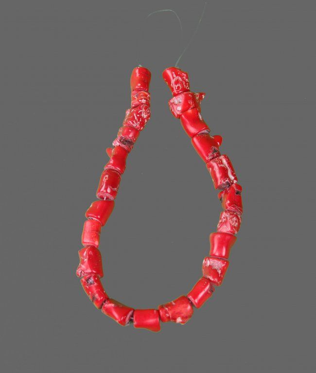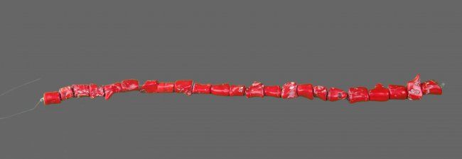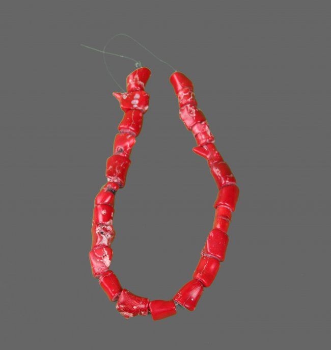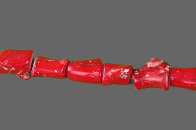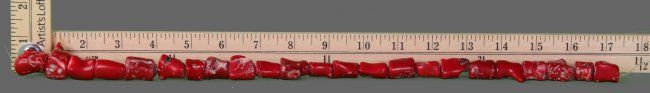 Red Coral Necklace, comprised of natural coral beads of irregular cylindrical shape with brilliant red color. (Size: See Last Photo for Measurements)