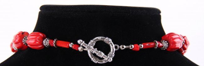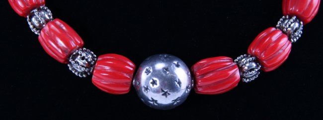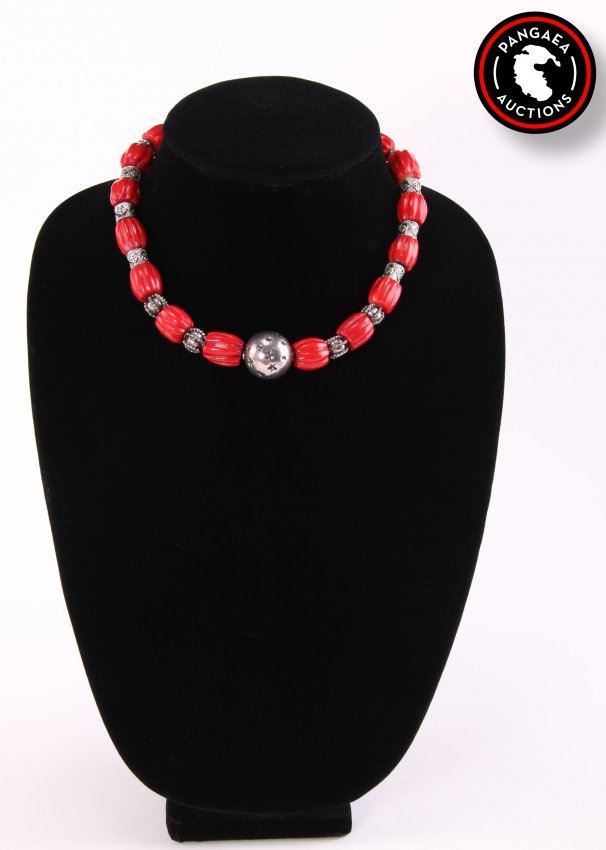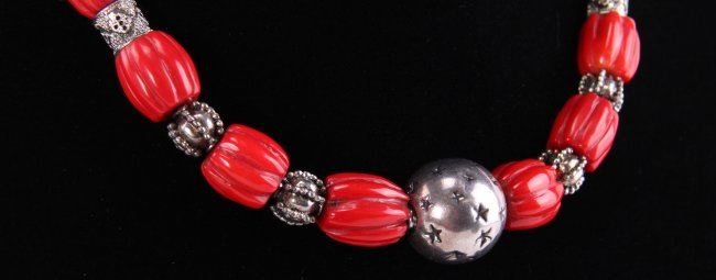 Red Coral and Sterling Silver Style Necklace. T-Clasp Hoop. Astral Engravings. SIZE: see attached ruler photo. Photos are part of the description representing the condition report and can be used for authentication prior to the auction date. Pangaea Auctions urges Bidder's to view all attached photos in detail. #(American, Vintage, Jewelry, Necklace, 925 Sterling Silver, Red Coral, )